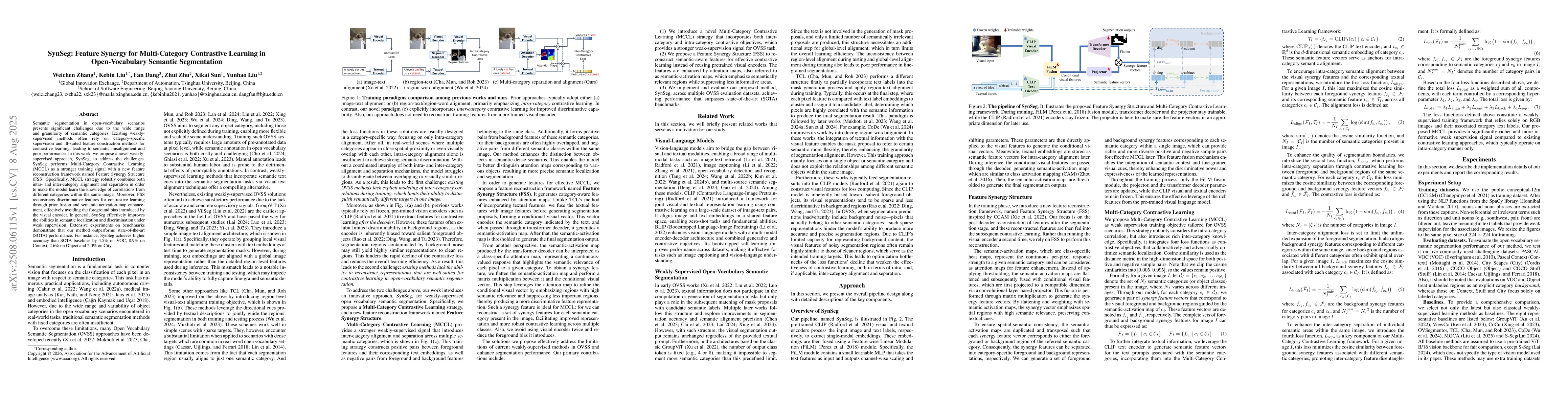 Semantic segmentation in open-vocabulary scenarios presents significant challenges due to the wide range and granularity of semantic categories. Existing weakly-supervised methods often rely on category-specific supervision and ill-suited feature construction methods for contrastive learning, leading to semantic misalignment and poor performance. In this work, we propose a novel weakly-supervised approach, SynSeg, to address the challenges. SynSeg performs Multi-Category Contrastive Learning (MCCL) as a stronger training signal with a new feature reconstruction framework named Feature Synergy Structure (FSS). Specifically, MCCL strategy robustly combines both intra- and inter-category alignment and separation in order to make the model learn the knowledge of correlations from different categories within the same image. Moreover, FSS reconstructs discriminative features for contrastive learning through prior fusion and semantic-activation-map enhancement, effectively avoiding the foreground bias introduced by the visual encoder. In general, SynSeg effectively improves the abilities in semantic localization and discrimination under weak supervision. Extensive experiments on benchmarks demonstrate that our method outperforms state-of-the-art (SOTA) performance. For instance, SynSeg achieves higher accuracy than SOTA baselines by 4.5\% on VOC, 8.9\% on Context, 2.6\% on Object and 2.0\% on City.