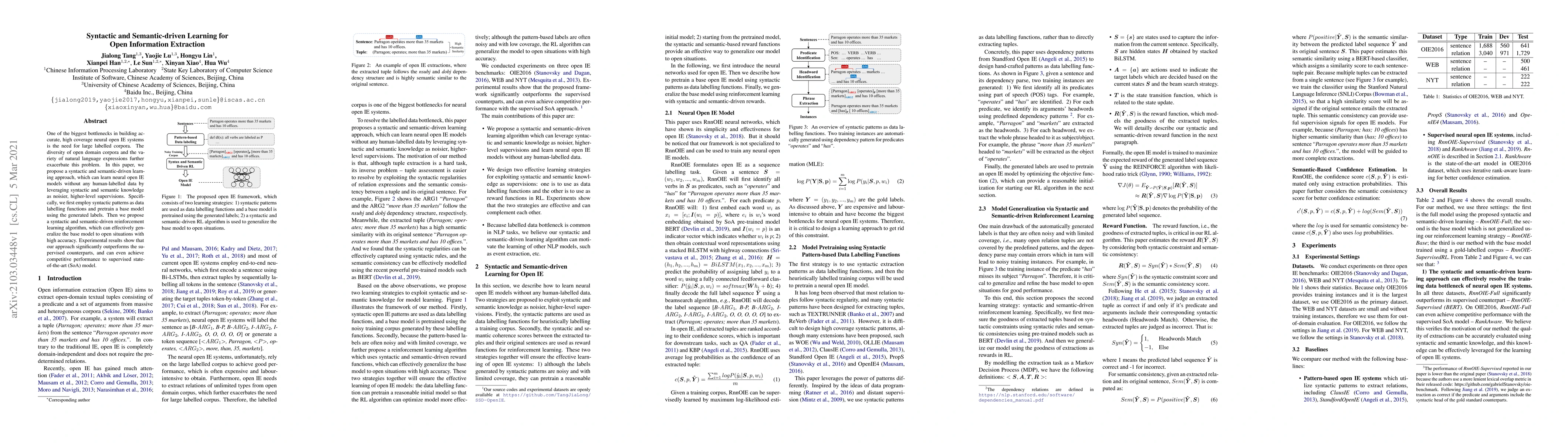 One of the biggest bottlenecks in building accurate, high coverage neural open IE systems is the need for large labelled corpora. The diversity of open domain corpora and the variety of natural language expressions further exacerbate this problem. In this paper, we propose a syntactic and semantic-driven learning approach, which can learn neural open IE models without any human-labelled data by leveraging syntactic and semantic knowledge as noisier, higher-level supervisions. Specifically, we first employ syntactic patterns as data labelling functions and pretrain a base model using the generated labels. Then we propose a syntactic and semantic-driven reinforcement learning algorithm, which can effectively generalize the base model to open situations with high accuracy. Experimental results show that our approach significantly outperforms the supervised counterparts, and can even achieve competitive performance to supervised state-of-the-art (SoA) model