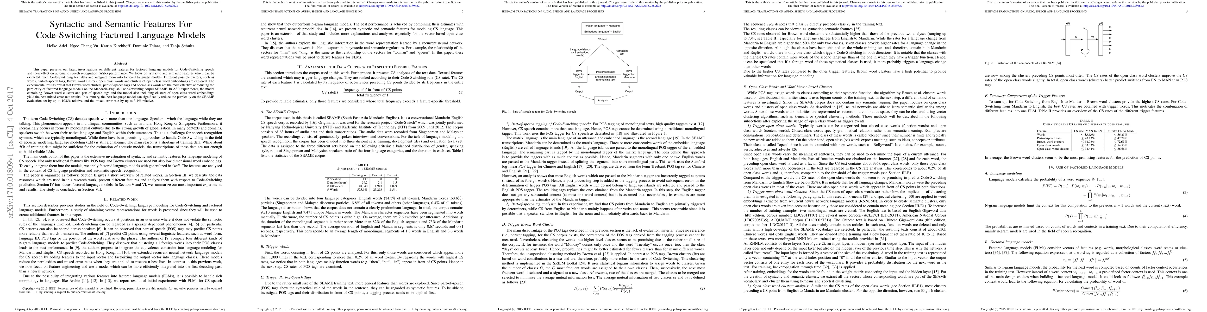 The paper presents an advanced factored language model incorporating syntactic and semantic features, demonstrating improved performance in code-switching ASR tasks.