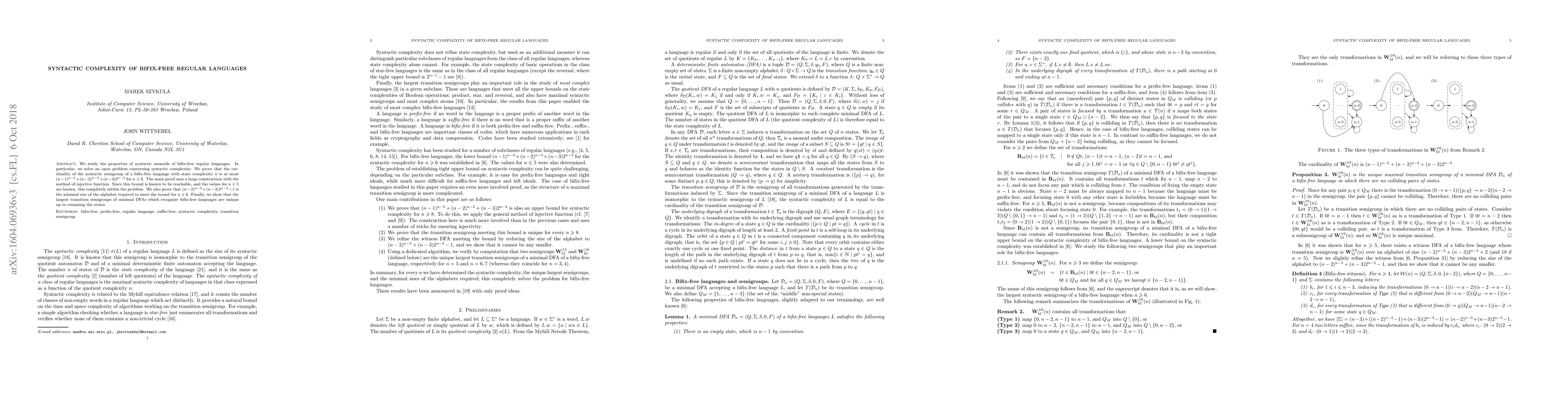 We study the properties of syntactic monoids of bifix-free regular languages. In particular, we solve an open problem concerning syntactic complexity: We prove that the cardinality of the syntactic semigroup of a bifix-free language with state complexity $n$ is at most $(n-1)^{n-3}+(n-2)^{n-3}+(n-3)2^{n-3}$ for $n\ge 6$. The main proof uses a large construction with the method of injective function. Since this bound is known to be reachable, and the values for $n \le 5$ are known, this completely settles the problem. We also prove that $(n-2)^{n-3} + (n-3)2^{n-3} - 1$ is the minimal size of the alphabet required to meet the bound for $n \ge 6$. Finally, we show that the largest transition semigroups of minimal DFAs which recognize bifix-free languages are unique up to renaming the states.