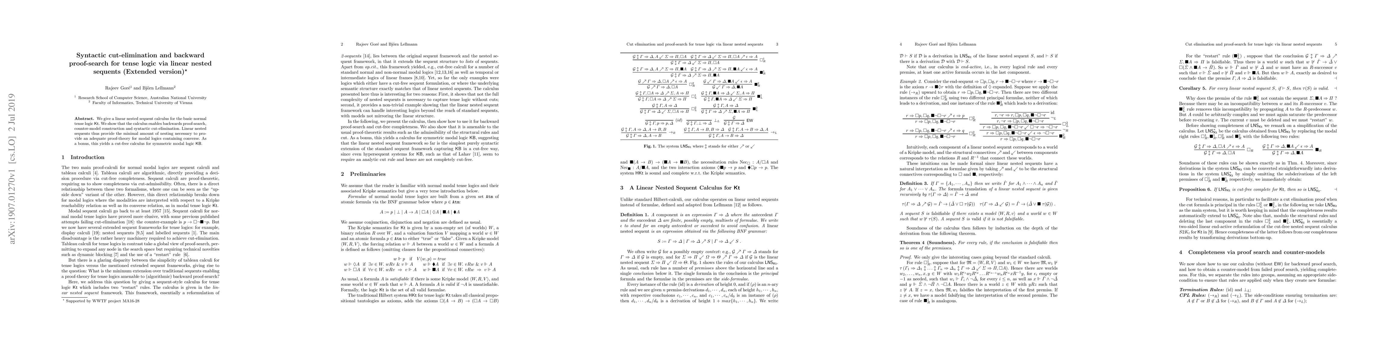 This research presents a linear nested sequent calculus for basic normal tense logic Kt, demonstrating its ability for backward proof-search, counter-model construction, and syntactic cut-elimination, and also yielding a cut-free calculus for symmetric modal logic KB.