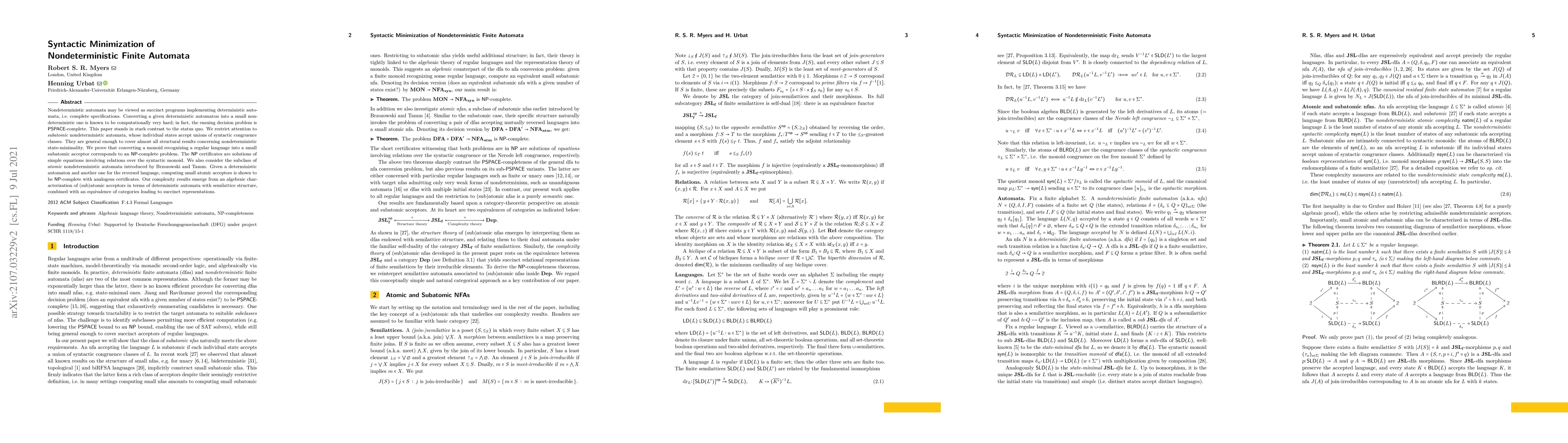 Nondeterministic automata may be viewed as succinct programs implementing deterministic automata, i.e. complete specifications. Converting a given deterministic automaton into a small nondeterministic one is known to be computationally very hard; in fact, the ensuing decision problem is PSPACE-complete. This paper stands in stark contrast to the status quo. We restrict attention to subatomic nondeterministic automata, whose individual states accept unions of syntactic congruence classes. They are general enough to cover almost all structural results concerning nondeterministic state-minimality. We prove that converting a monoid recognizing a regular language into a small subatomic acceptor corresponds to an NP-complete problem. The NP certificates are solutions of simple equations involving relations over the syntactic monoid. We also consider the subclass of atomic nondeterministic automata introduced by Brzozowski and Tamm. Given a deterministic automaton and another one for the reversed language, computing small atomic acceptors is shown to be NP-complete with analogous certificates. Our complexity results emerge from an algebraic characterization of (sub)atomic acceptors in terms of deterministic automata with semilattice structure, combined with an equivalence of categories leading to succinct representations.