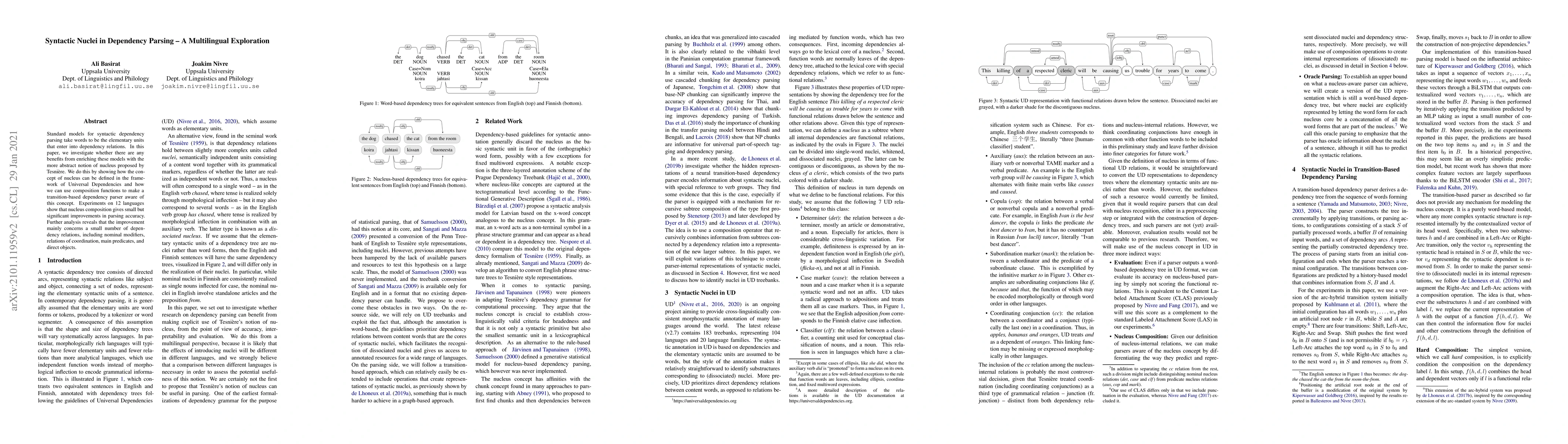This paper explores the integration of Tesni`ere's syntactic nucleus concept into dependency parsing models within the Universal Dependencies framework, demonstrating small but significant parsing accuracy improvements across 12 languages. The benefits are primarily observed in specific relations like nominal modifiers and coordination.