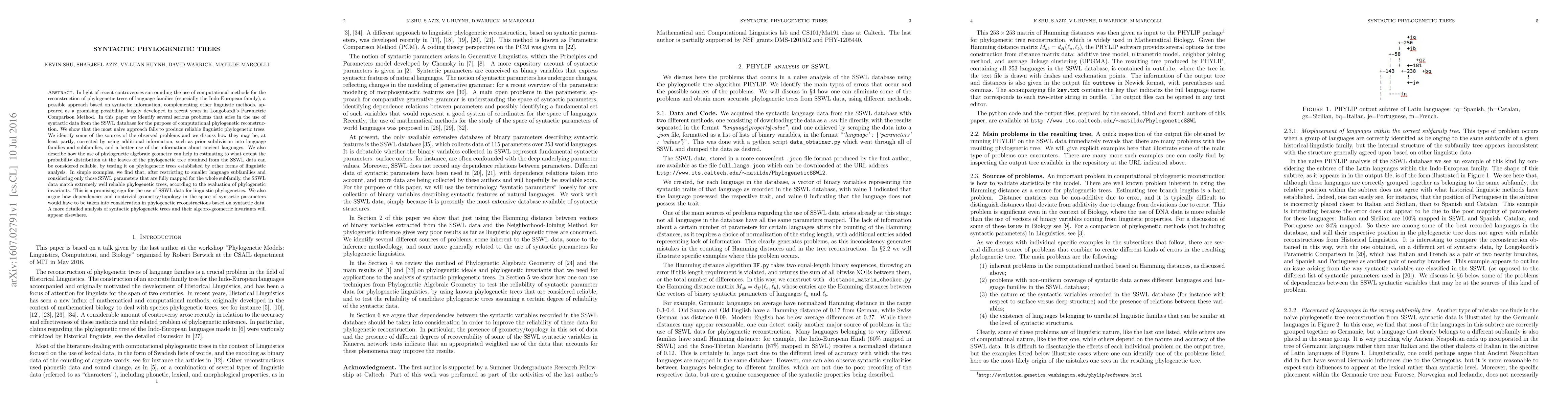 In this paper we identify several serious problems that arise in the use of syntactic data from the SSWL database for the purpose of computational phylogenetic reconstruction. We show that the most naive approach fails to produce reliable linguistic phylogenetic trees. We identify some of the sources of the observed problems and we discuss how they may be, at least partly, corrected by using additional information, such as prior subdivision into language families and subfamilies, and a better use of the information about ancient languages. We also describe how the use of phylogenetic algebraic geometry can help in estimating to what extent the probability distribution at the leaves of the phylogenetic tree obtained from the SSWL data can be considered reliable, by testing it on phylogenetic trees established by other forms of linguistic analysis. In simple examples, we find that, after restricting to smaller language subfamilies and considering only those SSWL parameters that are fully mapped for the whole subfamily, the SSWL data match extremely well reliable phylogenetic trees, according to the evaluation of phylogenetic invariants. This is a promising sign for the use of SSWL data for linguistic phylogenetics.