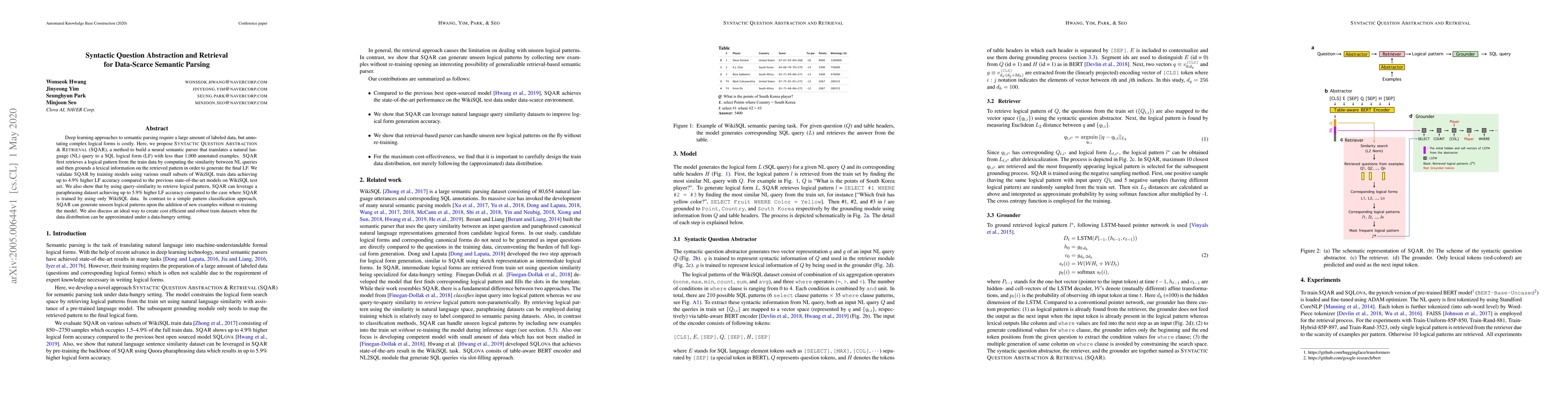 This paper introduces Syntactic Question Abstraction and Retrieval (SQAR), a method to build a neural semantic parser that translates natural language queries into SQL logical forms using less than 1,000 annotated examples. SQAR retrieves logical patterns from training data and leverages paraphrasing datasets to achieve higher accuracy, demonstrating flexibility and efficiency in data-scarce settings.