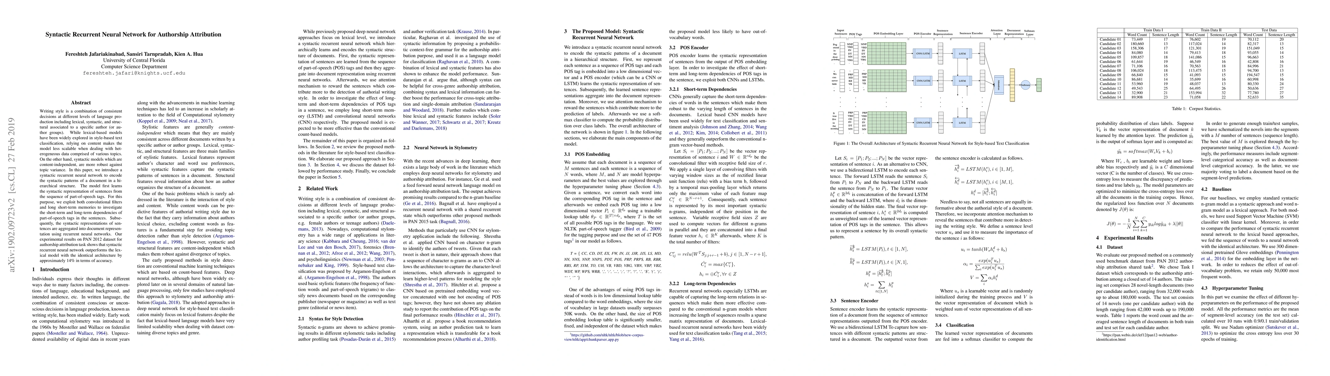 This paper proposes a syntactic recurrent neural network for authorship attribution, focusing on syntactic patterns rather than lexical content. The model uses convolutional and LSTM layers to capture syntactic dependencies, achieving better scalability and accuracy compared to lexical-based models, with a 14% improvement on the PAN 2012 dataset.