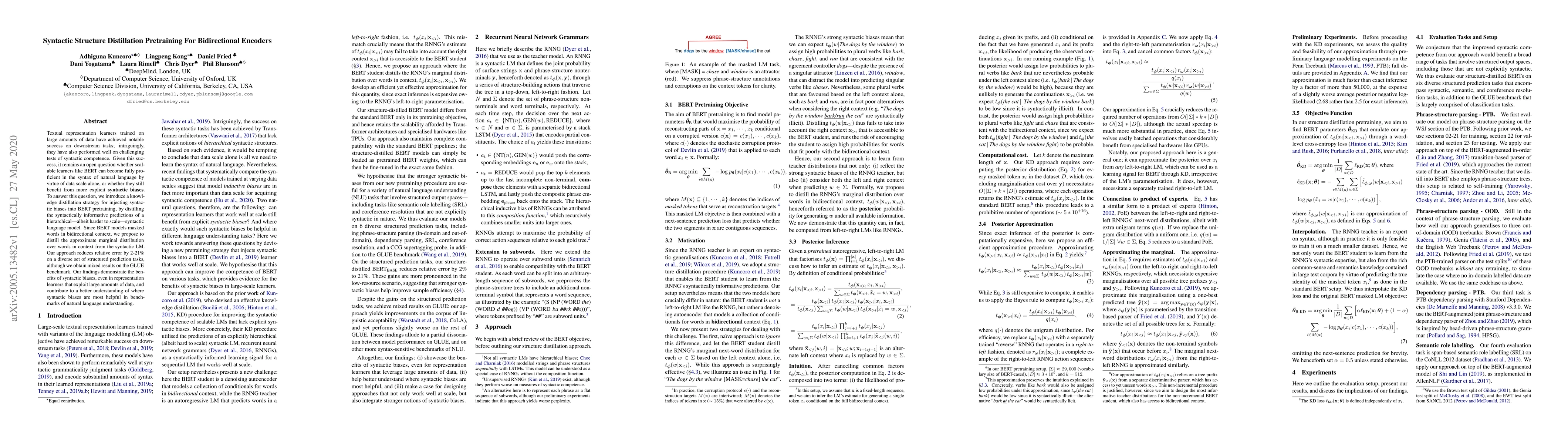 This paper proposes a knowledge distillation method to inject syntactic biases into BERT pretraining by distilling syntactically informative predictions from a hierarchical syntactic language model. The approach improves performance on structured prediction tasks but yields mixed results on the GLUE benchmark, highlighting the benefits of syntactic biases in large-scale representation learners.
