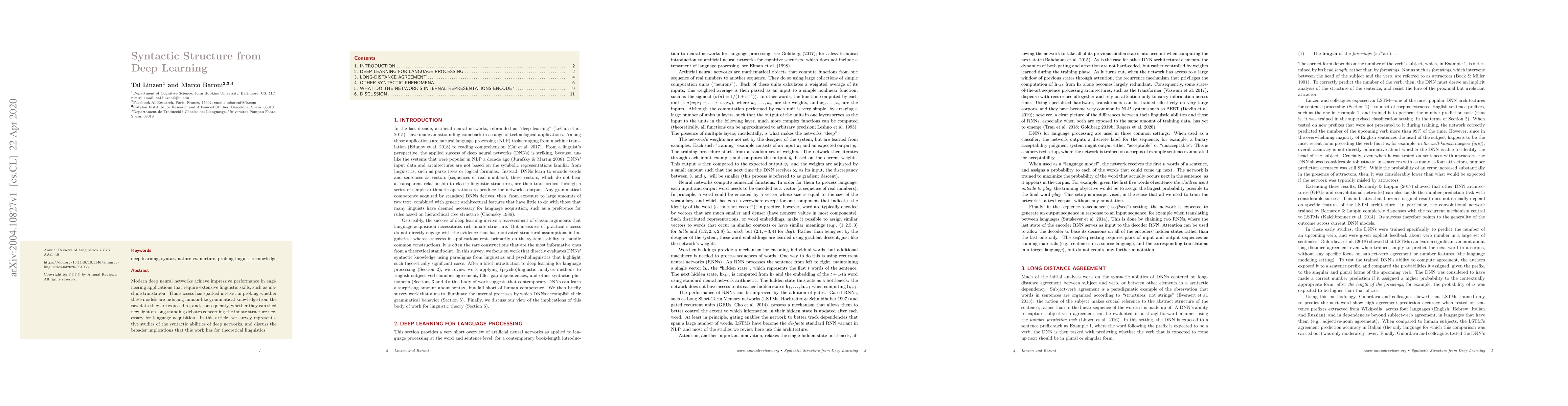 Modern deep neural networks achieve impressive performance in engineering applications that require extensive linguistic skills, such as machine translation. This success has sparked interest in probing whether these models are inducing human-like grammatical knowledge from the raw data they are exposed to, and, consequently, whether they can shed new light on long-standing debates concerning the innate structure necessary for language acquisition. In this article, we survey representative studies of the syntactic abilities of deep networks, and discuss the broader implications that this work has for theoretical linguistics.