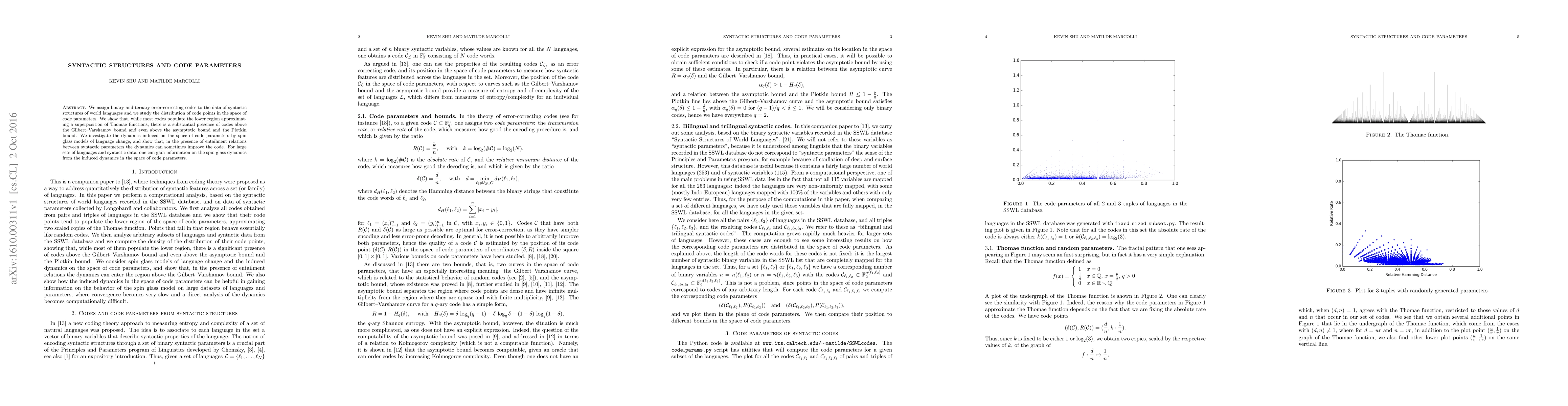 We assign binary and ternary error-correcting codes to the data of syntactic structures of world languages and we study the distribution of code points in the space of code parameters. We show that, while most codes populate the lower region approximating a superposition of Thomae functions, there is a substantial presence of codes above the Gilbert-Varshamov bound and even above the asymptotic bound and the Plotkin bound. We investigate the dynamics induced on the space of code parameters by spin glass models of language change, and show that, in the presence of entailment relations between syntactic parameters the dynamics can sometimes improve the code. For large sets of languages and syntactic data, one can gain information on the spin glass dynamics from the induced dynamics in the space of code parameters.