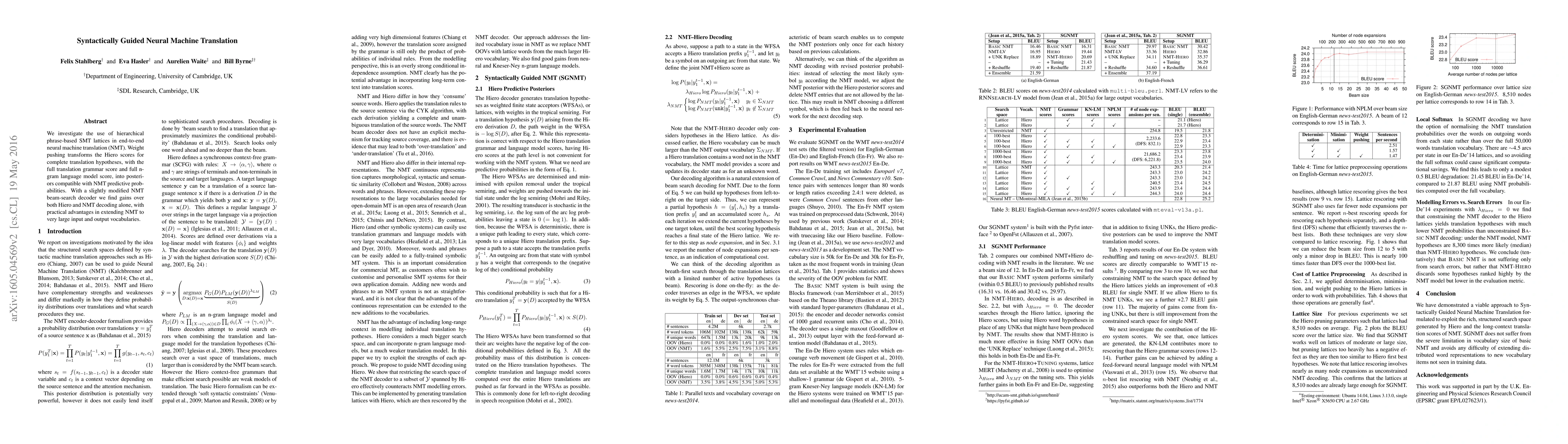 Researchers explored using hierarchical phrase-based SMT lattices in neural machine translation to improve performance, finding gains over existing methods with practical advantages for large vocabularies.