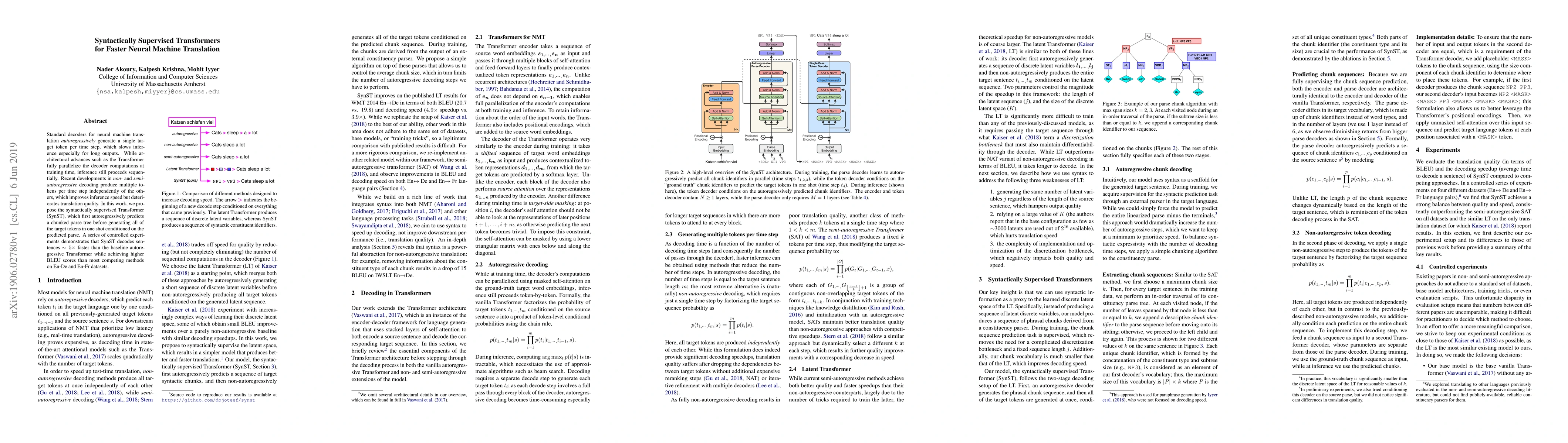 Researchers propose a new neural machine translation model called Syntactically Supervised Transformers (SynST) that generates entire sentences in one shot, leading to faster inference speeds while maintaining higher translation quality.