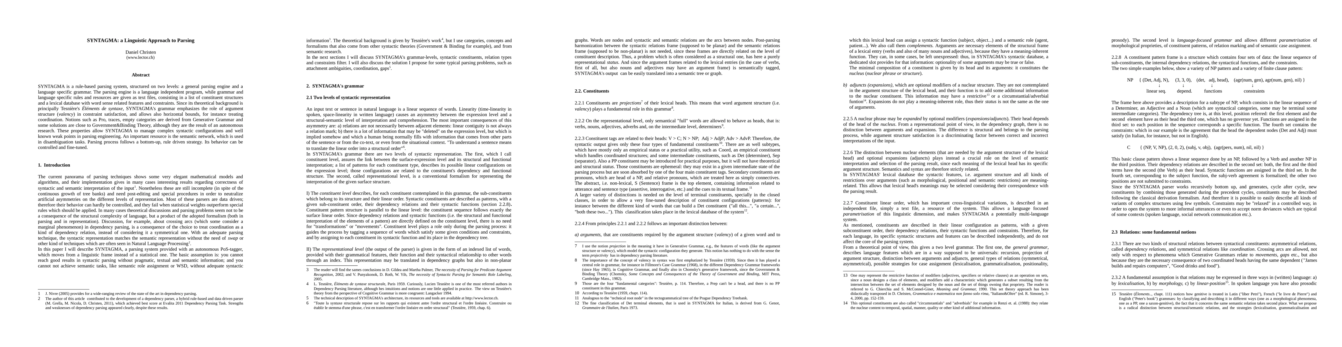 SYNTAGMA is a rule-based parsing system, structured on two levels: a general parsing engine and a language specific grammar. The parsing engine is a language independent program, while grammar and language specific rules and resources are given as text files, consisting in a list of constituent structuresand a lexical database with word sense related features and constraints. Since its theoretical background is principally Tesniere's Elements de syntaxe, SYNTAGMA's grammar emphasizes the role of argument structure (valency) in constraint satisfaction, and allows also horizontal bounds, for instance treating coordination. Notions such as Pro, traces, empty categories are derived from Generative Grammar and some solutions are close to Government&Binding Theory, although they are the result of an autonomous research. These properties allow SYNTAGMA to manage complex syntactic configurations and well known weak points in parsing engineering. An important resource is the semantic network, which is used in disambiguation tasks. Parsing process follows a bottom-up, rule driven strategy. Its behavior can be controlled and fine-tuned.