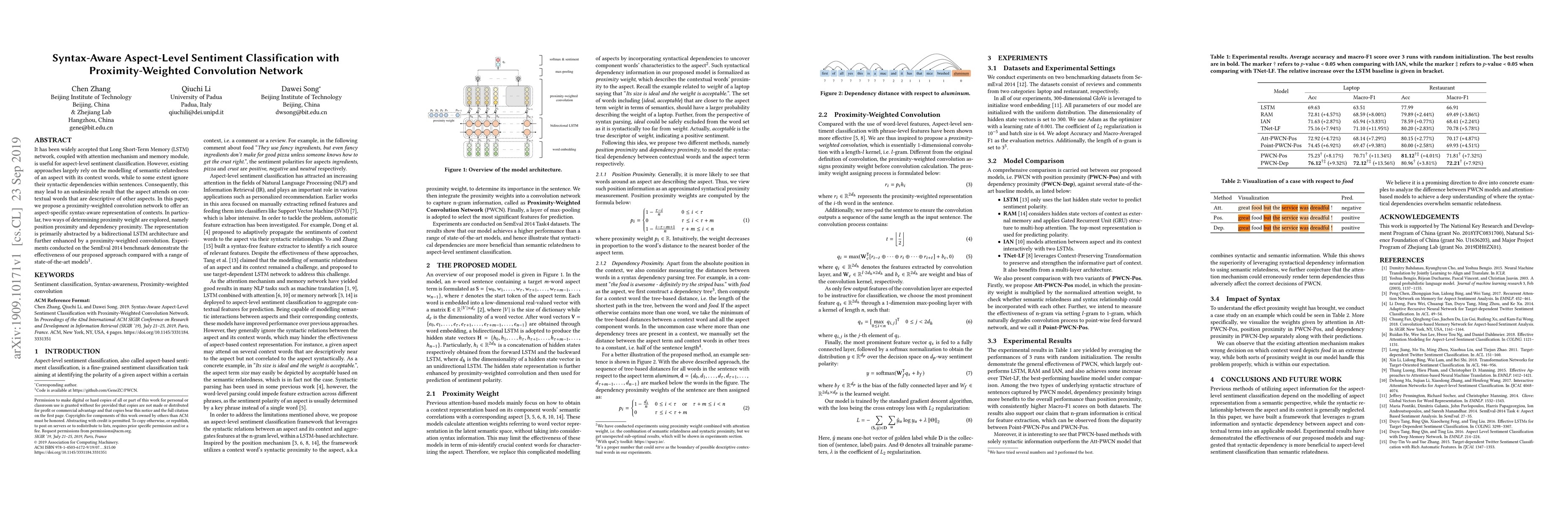 This paper proposes a syntax-aware aspect-level sentiment classification method using a proximity-weighted convolution network that considers both position and dependency proximity. The model effectively distinguishes aspect-specific syntactic dependencies, outperforming existing semantic-focused methods in experiments.