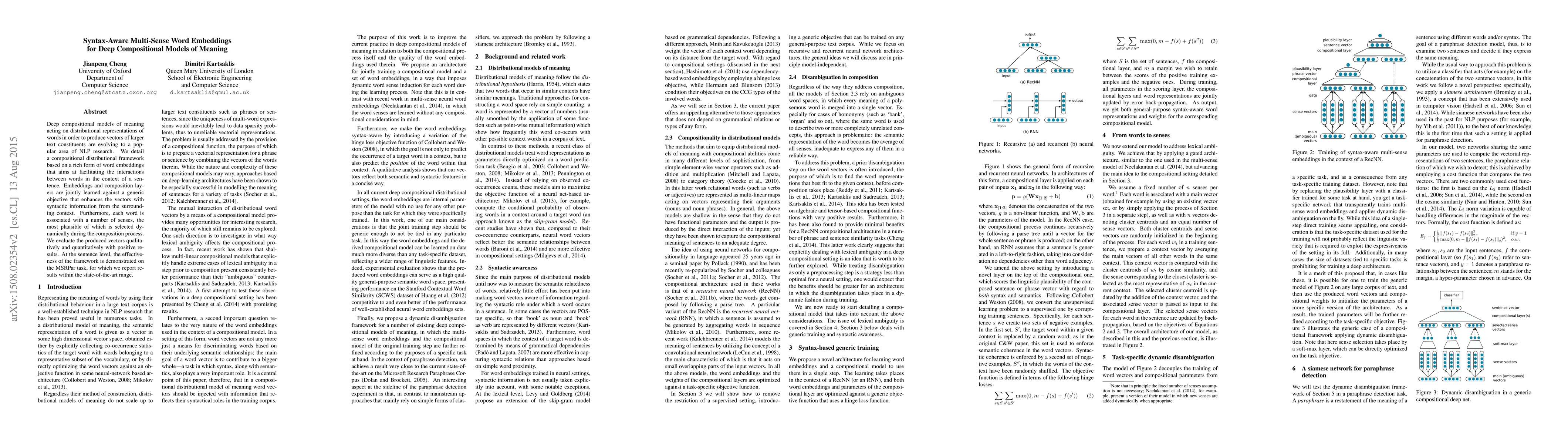 This paper proposes a syntax-aware framework for multi-sense word embeddings to enhance deep compositional models of meaning, achieving state-of-the-art results on the MSRPar task. The model dynamically selects the most plausible sense of each word and integrates syntactic context to improve vector representations of larger text constituents.