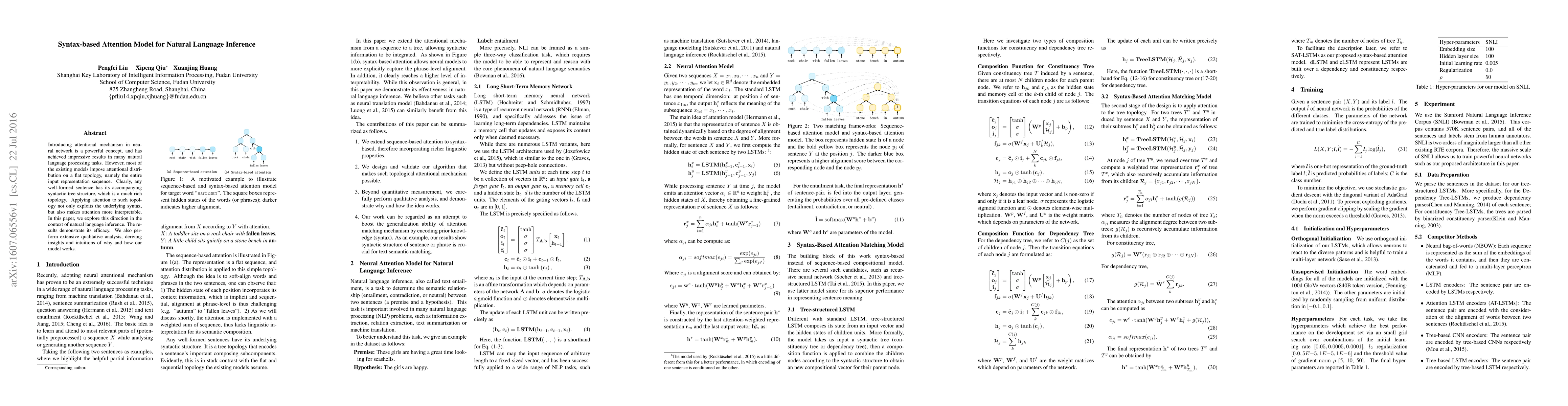This paper proposes a syntax-based attention model for natural language inference that applies attention to the syntactic tree structure of sentences, enhancing interpretability and performance by leveraging syntactic information. Results show improved efficacy and qualitative analysis provides insights into the model's functioning.