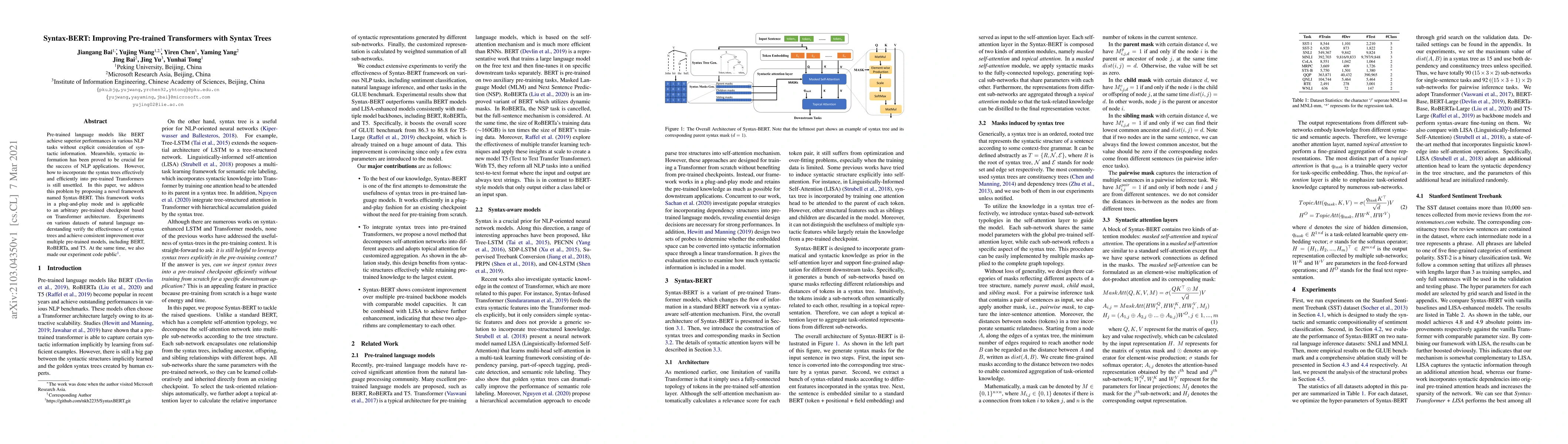 Syntax-BERT integrates syntax trees into pre-trained Transformer models to enhance their performance on NLP tasks. The proposed framework consistently improves various models, including BERT, RoBERTa, and T5, by incorporating syntactic information without requiring significant modifications.