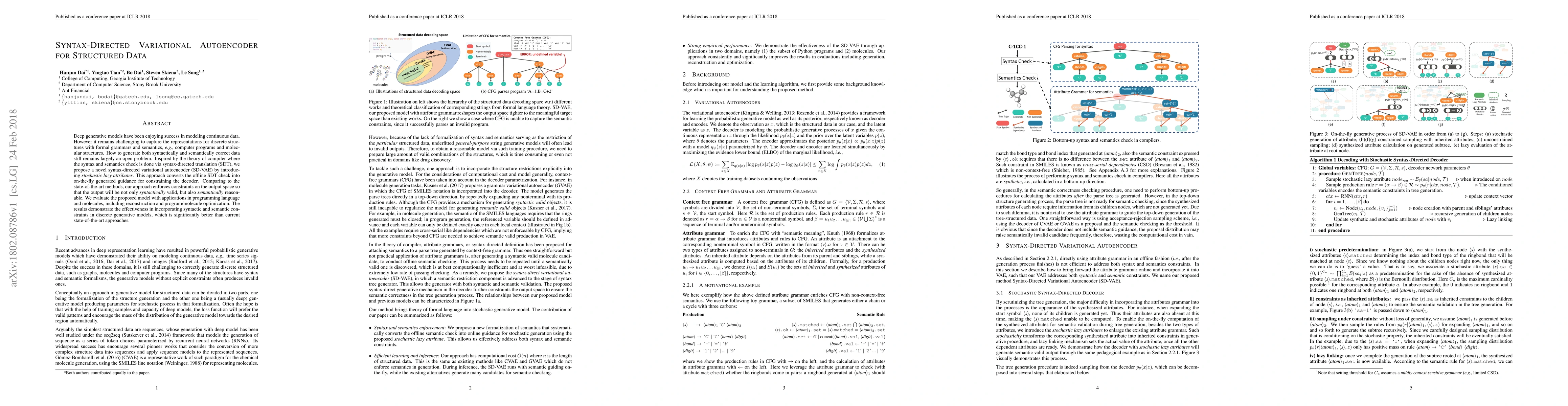 This research introduces a syntax-directed variational autoencoder (SD-VAE) that enhances generative models for structured data by incorporating syntactic and semantic constraints through stochastic lazy attributes, achieving both syntactic validity and semantic reasonableness in generated discrete structures. The model outperforms existing methods in tasks involving programming languages and molecular structures.