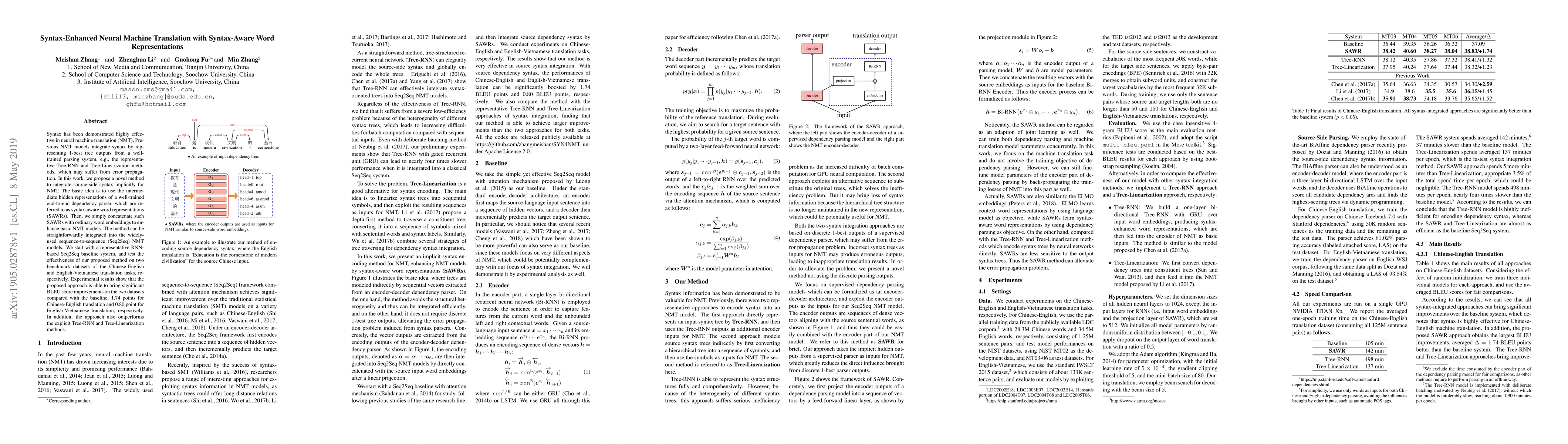 The paper proposes a method to integrate source-side syntax implicitly in neural machine translation using syntax-aware word representations derived from a dependency parser, which, when concatenated with ordinary word embeddings, enhance NMT models. Experimental results show significant BLEU score improvements compared to baseline and explicit syntax-based methods.
