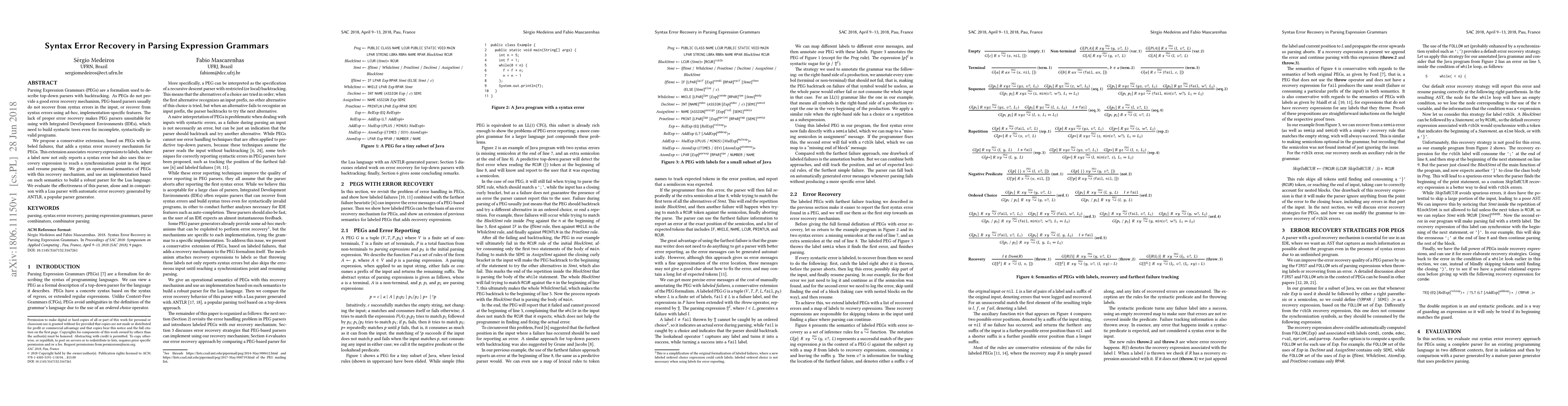This paper proposes a conservative extension to Parsing Expression Grammars (PEGs) to add a syntax error recovery mechanism, enabling parsers to handle incomplete or invalid input. The extension uses labeled failures and recovery expressions to identify and resume parsing from synchronization points.