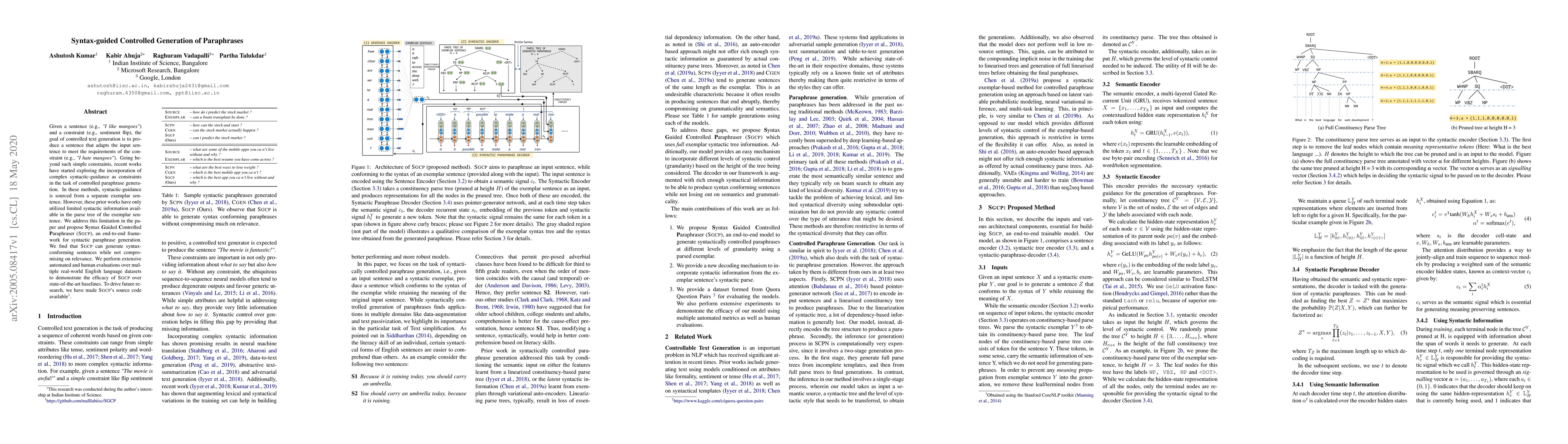 This paper introduces the Syntax Guided Controlled Paraphraser (SGCP), a framework for generating syntactically-guided paraphrases that adapts input sentences according to specified constraints, such as sentiment flips. The authors demonstrate SGCP's superior performance over existing methods through extensive evaluations on multiple datasets.