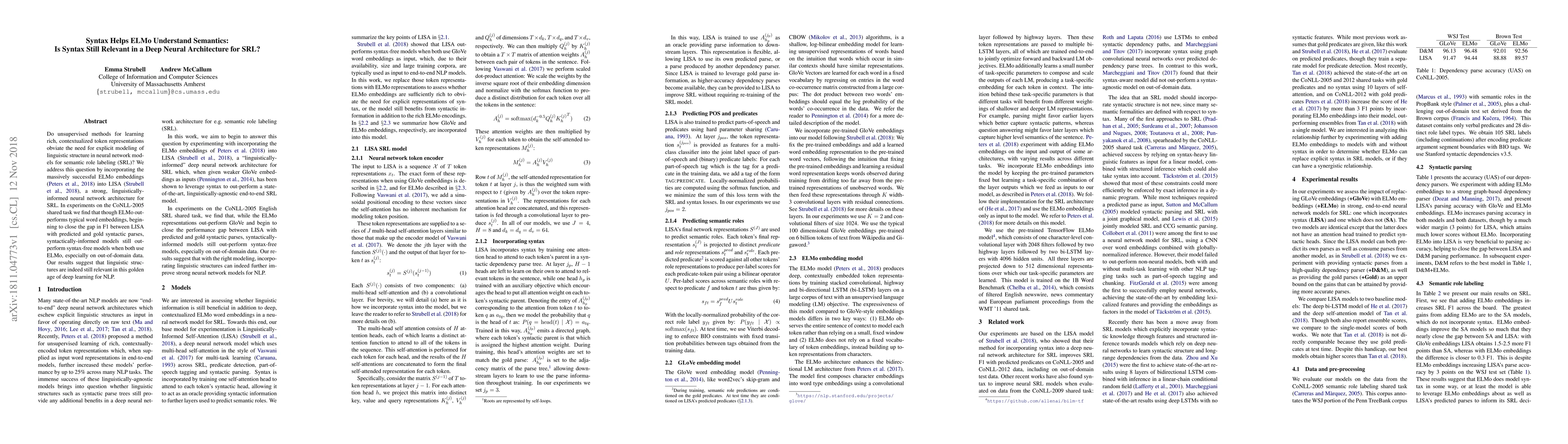 Do unsupervised methods for learning rich, contextualized token representations obviate the need for explicit modeling of linguistic structure in neural network models for semantic role labeling (SRL)? We address this question by incorporating the massively successful ELMo embeddings (Peters et al., 2018) into LISA (Strubell et al., 2018), a strong, linguistically-informed neural network architecture for SRL. In experiments on the CoNLL-2005 shared task we find that though ELMo out-performs typical word embeddings, beginning to close the gap in F1 between LISA with predicted and gold syntactic parses, syntactically-informed models still out-perform syntax-free models when both use ELMo, especially on out-of-domain data. Our results suggest that linguistic structures are indeed still relevant in this golden age of deep learning for NLP.