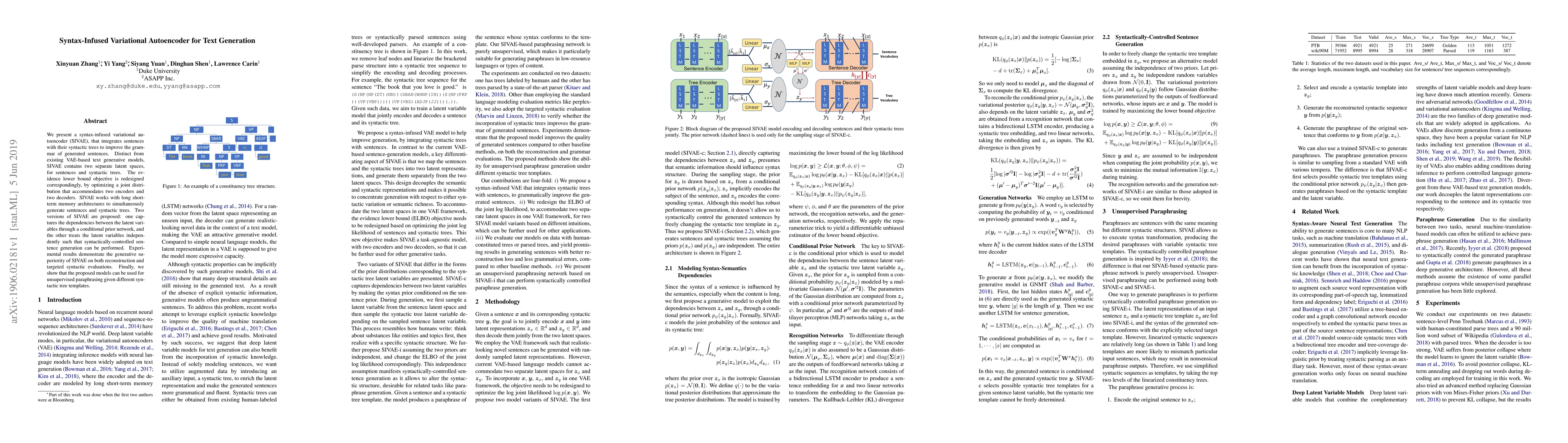 The research introduces a syntax-infused variational autoencoder (SIVAE) that enhances text generation by integrating syntactic trees, featuring two latent spaces and redesigned objective functions. The model demonstrates superior generative performance and can perform unsupervised paraphrasing with different syntactic structures.