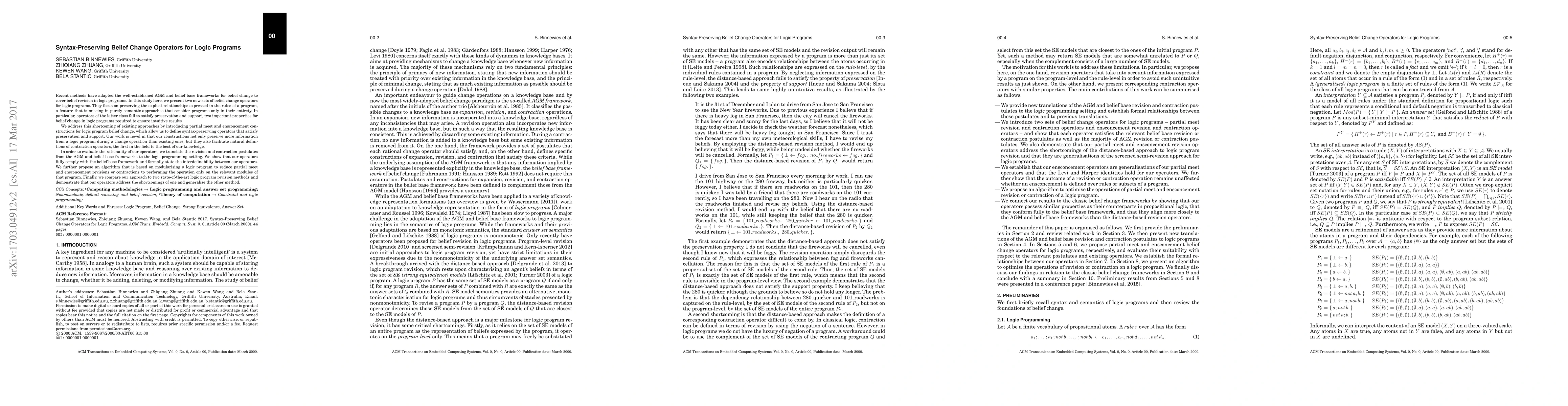 This paper introduces two new sets of syntax-preserving belief change operators for logic programs that preserve explicit relationships in program rules, addressing limitations of purely semantic approaches. The proposed operators satisfy preservation and support properties, and an algorithm is presented for efficient modularisation of logic programs during belief change operations.