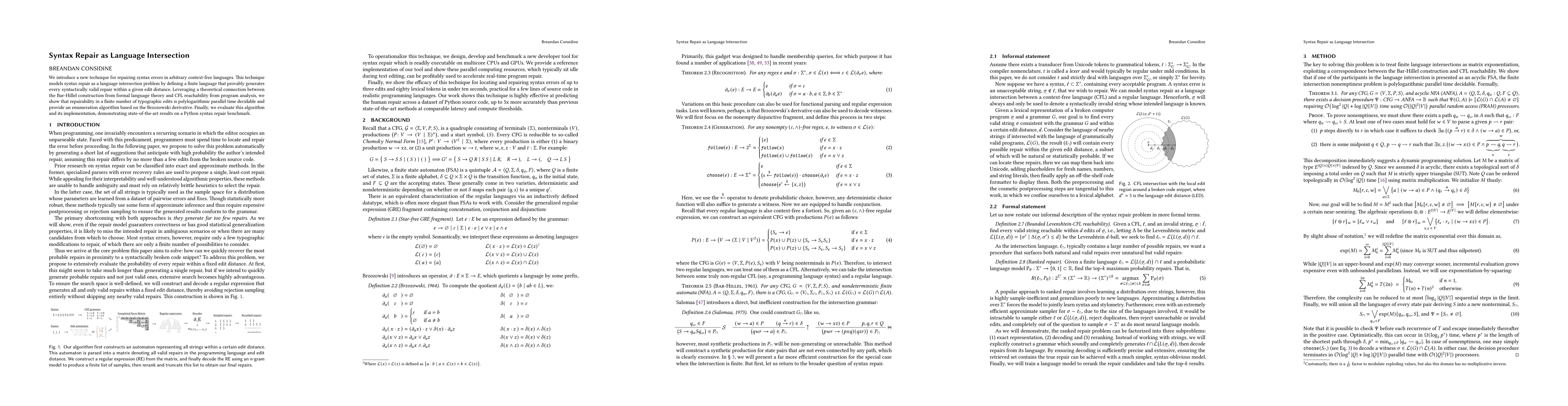 We introduce a new technique for repairing syntax errors in arbitrary context-free languages. This technique models syntax repair as a language intersection problem by defining a finite language that provably generates every syntactically valid repair within a given edit distance. Leveraging a theoretical connection between the Bar-Hillel construction from formal language theory and CFL reachability from program analysis, we show that repairability in a finite number of typographic edits is polylogarithmic parallel time decidable and provide an enumeration algorithm based on the Brzozowski derivative. Finally, we evaluate this algorithm and its implementation, demonstrating state-of-the-art results on a Python syntax repair benchmark.