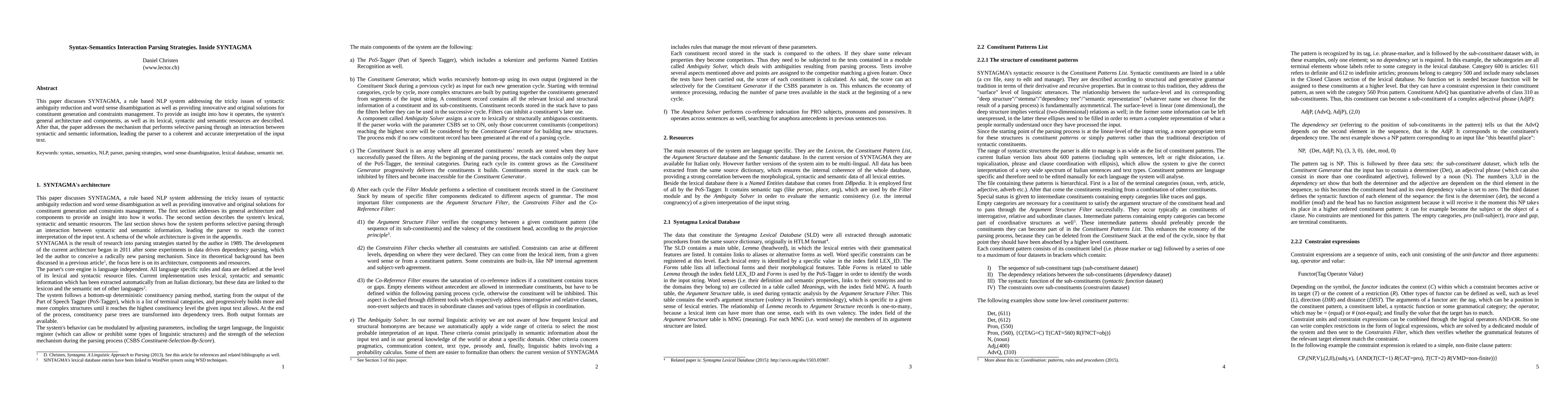 This paper discusses SYNTAGMA, a rule based NLP system addressing the tricky issues of syntactic ambiguity reduction and word sense disambiguation as well as providing innovative and original solutions for constituent generation and constraints management. To provide an insight into how it operates, the system's general architecture and components, as well as its lexical, syntactic and semantic resources are described. After that, the paper addresses the mechanism that performs selective parsing through an interaction between syntactic and semantic information, leading the parser to a coherent and accurate interpretation of the input text.