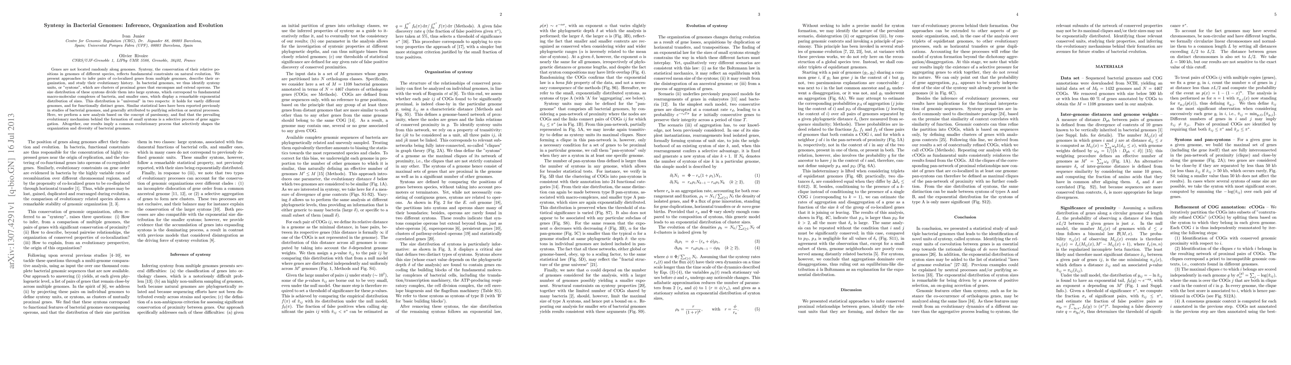 This paper presents methods to infer and analyze synteny in bacterial genomes, identifying clusters of co-localized genes termed syntons. It reveals a universal exponential distribution in the sizes of smaller syntons, suggesting that selective gene aggregation, rather than neutral processes, drives their formation and shapes the evolutionary organization of bacterial genomes.