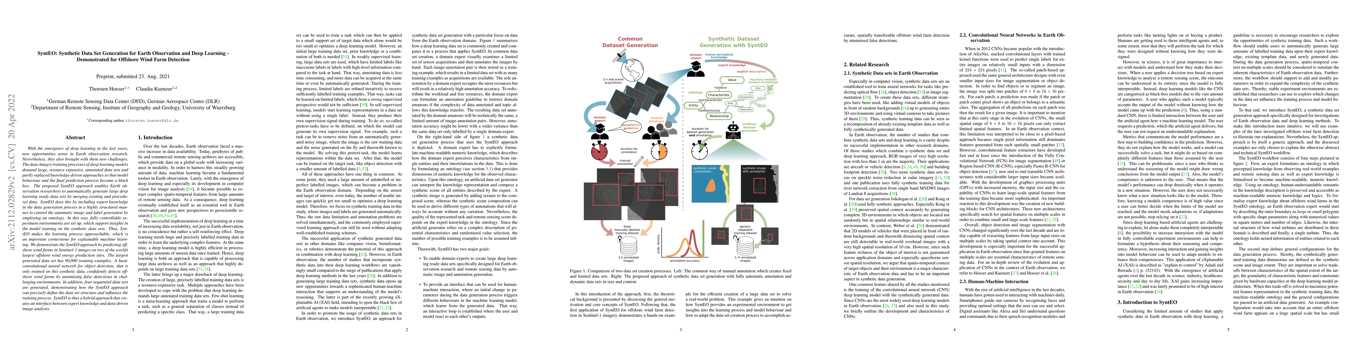 Researchers developed SyntEO, a method to generate synthetic data sets for Earth observation using expert knowledge, allowing for controllable experiment environments and explainable machine learning. The approach generated large datasets with 90,000 training examples, which were used to train a convolutional neural network to detect offshore wind farms with high accuracy.