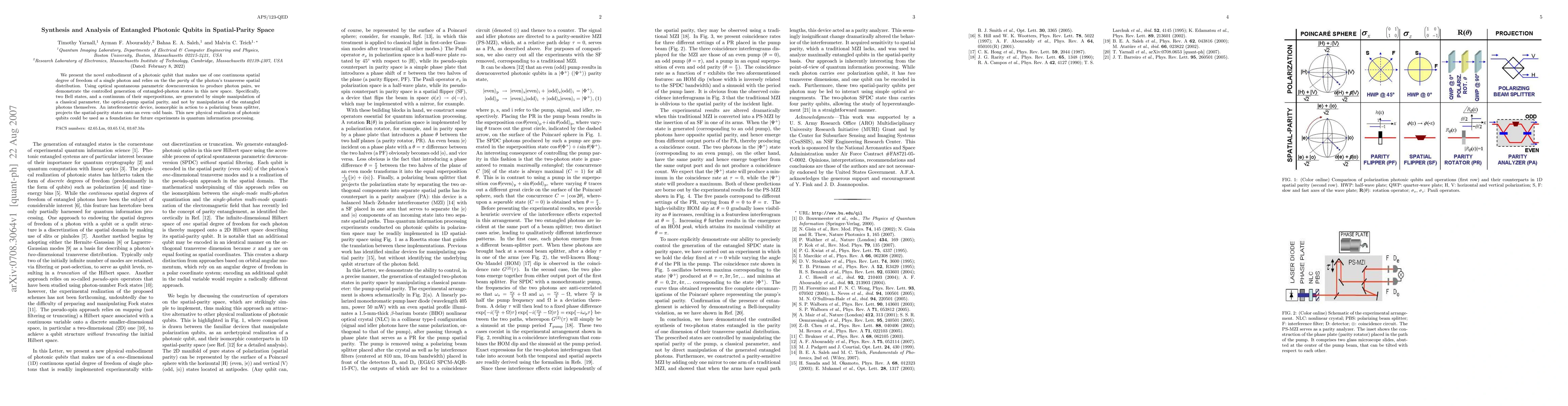We present the novel embodiment of a photonic qubit that makes use of one continuous spatial degree of freedom of a single photon and relies on the the parity of the photon's transverse spatial distribution. Using optical spontaneous parametric downconversion to produce photon pairs, we demonstrate the controlled generation of entangled-photon states in this new space. Specifically, two Bell states, and a continuum of their superpositions, are generated by simple manipulation of a classical parameter, the optical-pump spatial parity, and not by manipulation of the entangled photons themselves. An interferometric device, isomorphic in action to a polarizing beam splitter, projects the spatial-parity states onto an even--odd basis. This new physical realization of photonic qubits could be used as a foundation for future experiments in quantum information processing.
