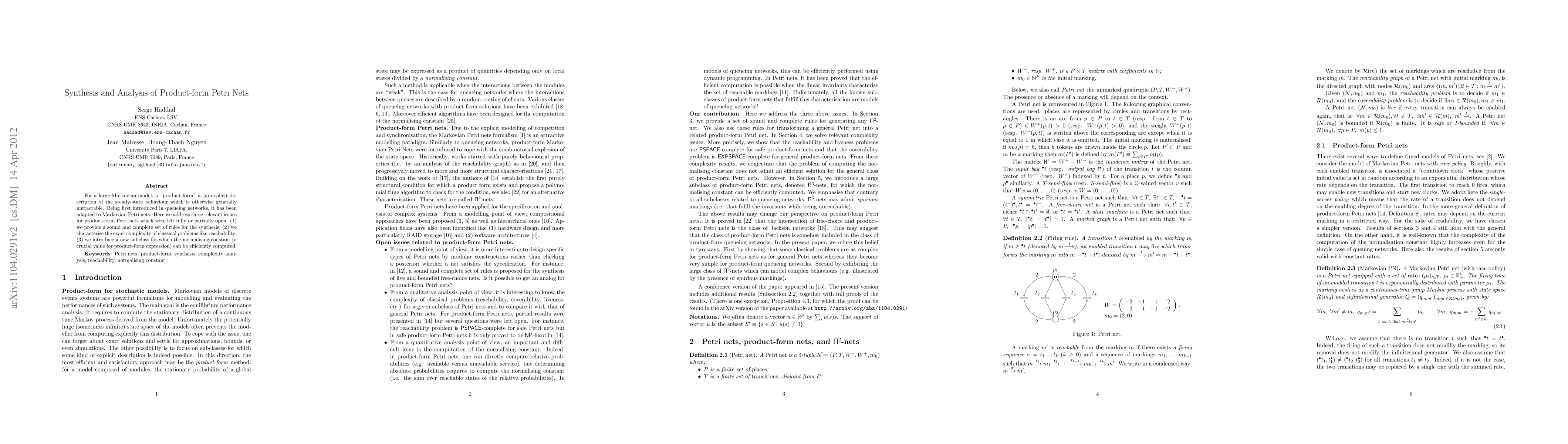 This paper develops a comprehensive framework for the synthesis of product-form Petri nets, establishes the complexity of key problems such as reachability, and introduces a new subclass allowing efficient computation of the normalising constant.