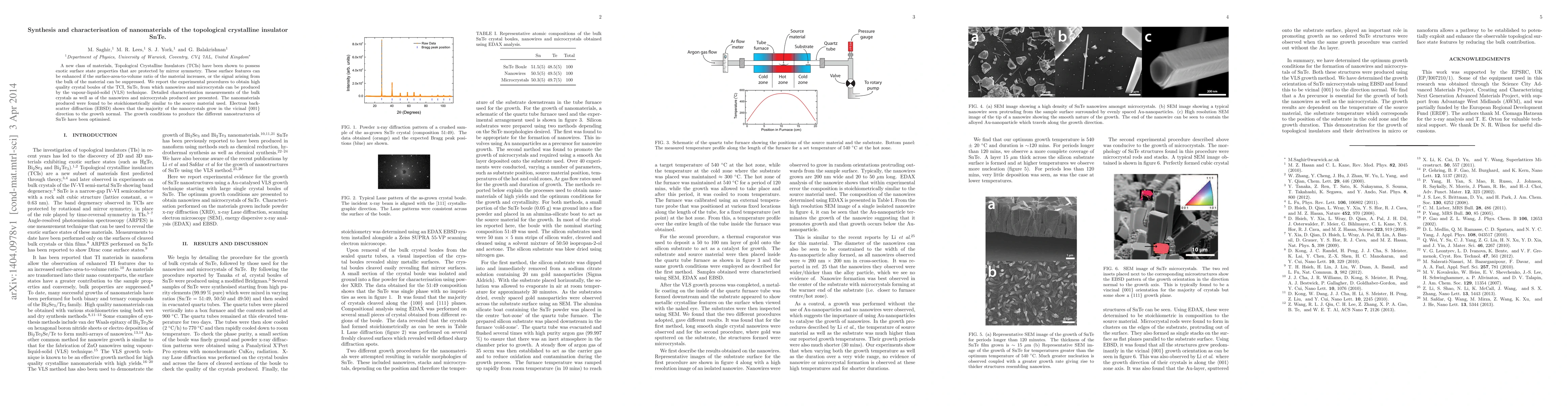This research paper details the synthesis and characterisation of nanomaterials from the topological crystalline insulator SnTe, using the vapour-liquid-solid technique to produce high-quality nanowires and microcrystals. Electron back-scatter diffraction reveals that most nanocrystals grow in the {001} direction, highlighting optimised growth conditions for these nanostructures.