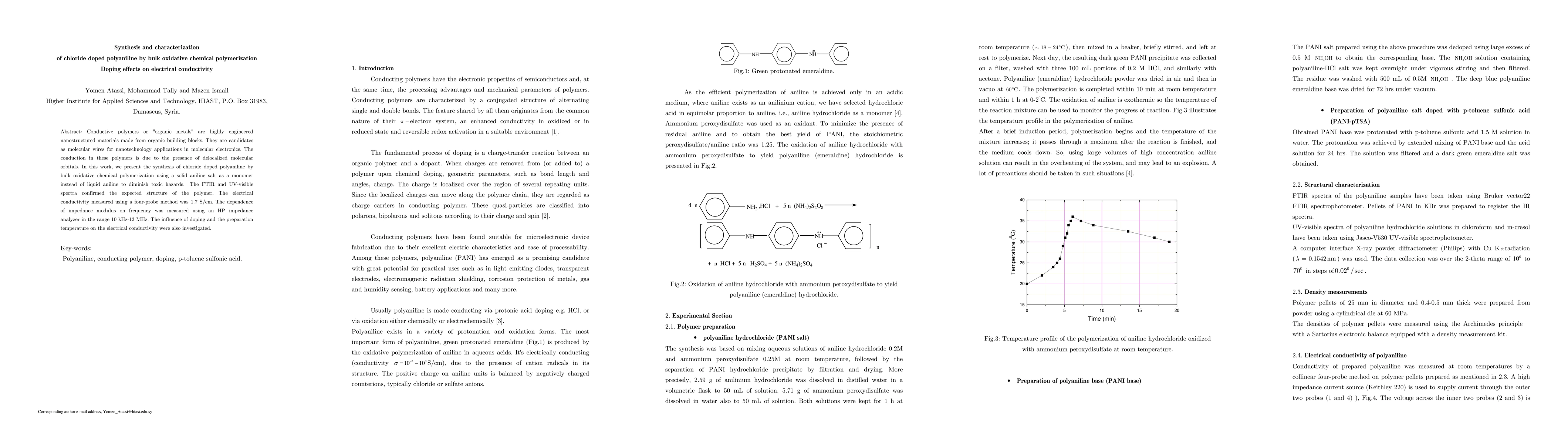 Conductive polymers or "organic metals" are highly engineered nanostructured materials made from organic building blocks. They are candidates as molecular wires for nanotechnology applications in molecular electronics. The conduction in these polymers is due to the presence of delocalized molecular orbitals. In this work, we present the synthesis of chloride doped polyaniline by bulk oxidative chemical polymerization using a solid aniline salt as a monomer instead of liquid aniline to diminish toxic hazards. The FTIR and UV-visible spectra confirmed the expected structure of the polymer. The electrical conductivity measured using a four-probe method was 1.7 S/cm. The dependence of impedance modulus on frequency was measured using an HP impedance analyzer in the range 10 kHz-13 MHz. The influence of doping and the preparation temperature on the electrical conductivity were also investigated.