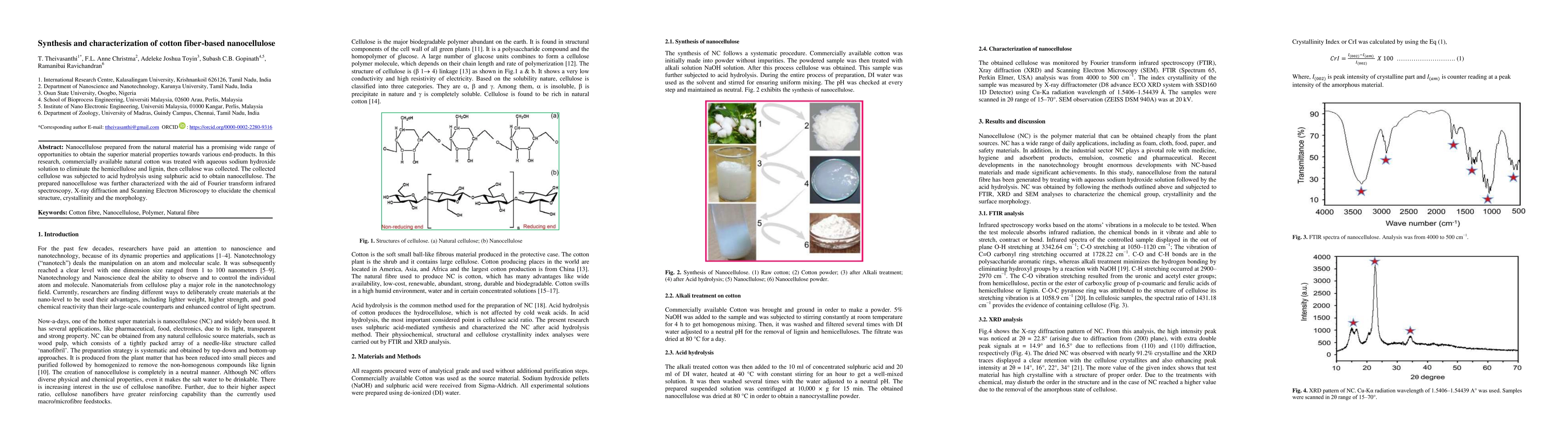 Nanocellulose prepared from the natural material has a promising wide range of opportunities to obtain the superior material properties towards various end-products. In this research, commercially available natural cotton was treated with aqueous sodium hydroxide solution to eliminate the hemicellulose and lignin, then cellulose was collected. The collected cellulose was subjected to acid hydrolysis using sulphuric acid to obtain nanocellulose. The prepared nanocellulose was further characterized with the aid of Fourier transform infrared spectroscopy, X-ray diffraction and Scanning Electron Microscopy to elucidate the chemical structure, crystallinity and the morphology.