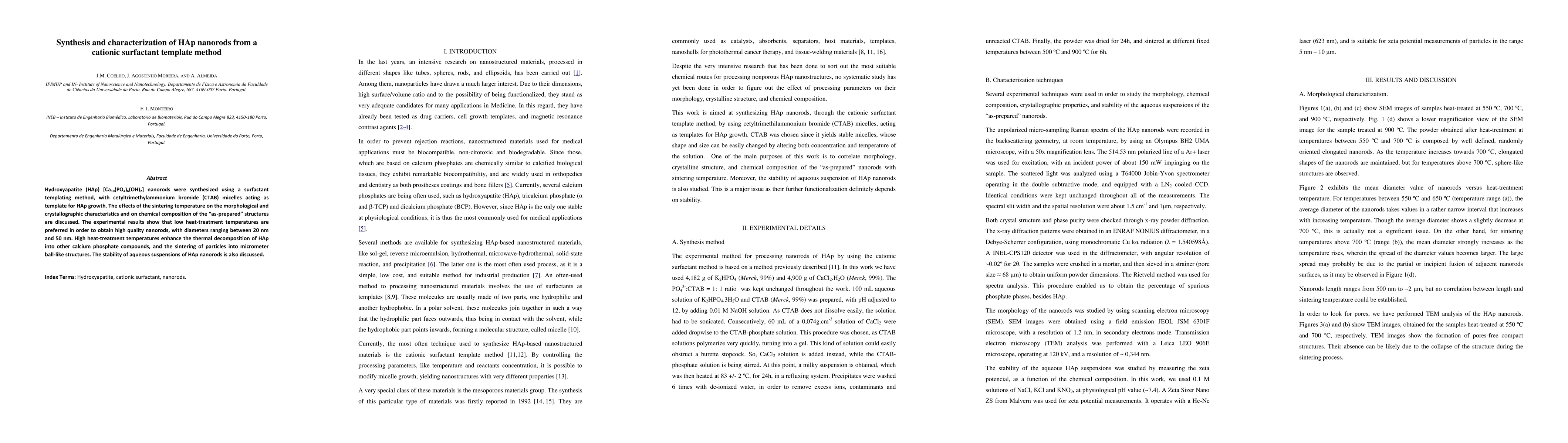 Hydroxyapatite (HAp) [Ca10(PO4)6(OH)2] nanorods were synthesized using a surfactant templating method, with cetyltrimethylammonium bromide (CTAB) micelles acting as template for HAp growth. The effects of the sintering temperature on the morphological and crystallographic characteristics and on chemical composition of the "as-prepared" structures are discussed. The experimental results show that low heat-treatment temperatures are preferred in order to obtain high quality nanorods, with diameters ranging between 20 nm and 50 nm. High heat-treatment temperatures enhance the thermal decomposition of HAp into other calcium phosphate compounds, and the sintering of particles into micrometer ball-like structures. The stability of aqueous suspensions of HAp nanorods is also discussed.