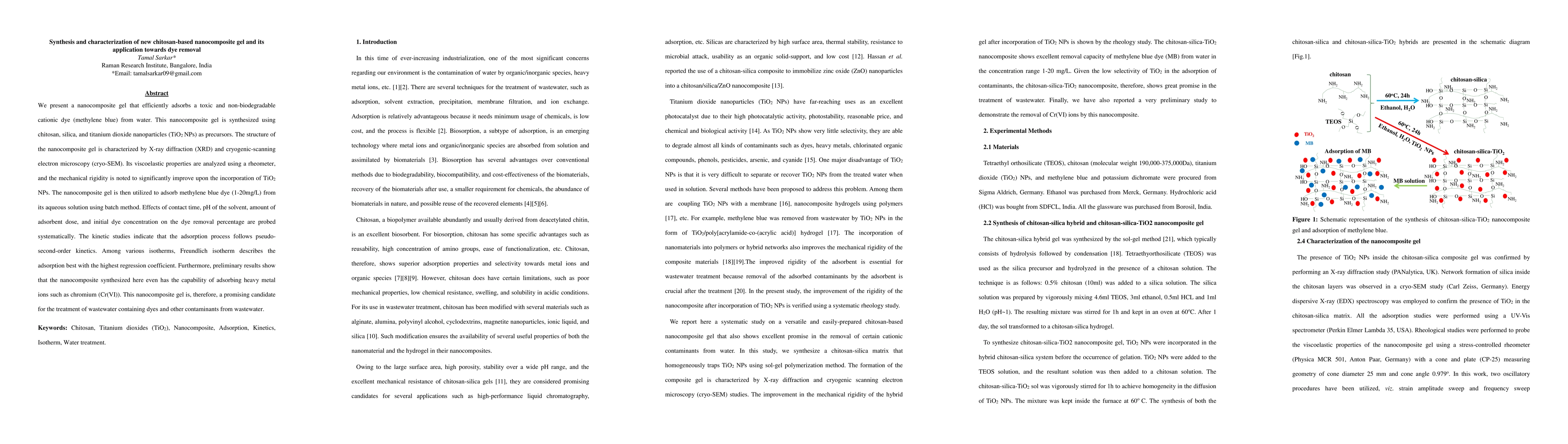 We present a nanocomposite gel that efficiently adsorbs a toxic and non-biodegradable cationic dye (methylene blue) from water. This nanocomposite gel is synthesized using chitosan, silica, and titanium dioxide nanoparticles (TiO2 NPs) as precursors. The structure of the nanocomposite gel is characterized by X-ray diffraction (XRD) and cryogenic-scanning electron microscopy (cryo-SEM). Its viscoelastic properties are analyzed using a rheometer, and the mechanical rigidity is noted to significantly improve upon the incorporation of TiO2 NPs. The nanocomposite gel is then utilized to adsorb methylene blue dye (1-20mg/L) from its aqueous solution using batch method. Effects of contact time, pH of the solvent, amount of adsorbent dose, and initial dye concentration on the dye removal percentage are probed systematically. The kinetic studies indicate that the adsorption process follows pseudo-second-order kinetics. Among various isotherms, Freundlich isotherm describes the adsorption best with the highest regression coefficient. Furthermore, preliminary results show that the nanocomposite synthesized here even has the capability of adsorbing heavy metal ions such as chromium (Cr(VI)). This nanocomposite gel is, therefore, a promising candidate for the treatment of wastewater containing dyes and other contaminants from wastewater.