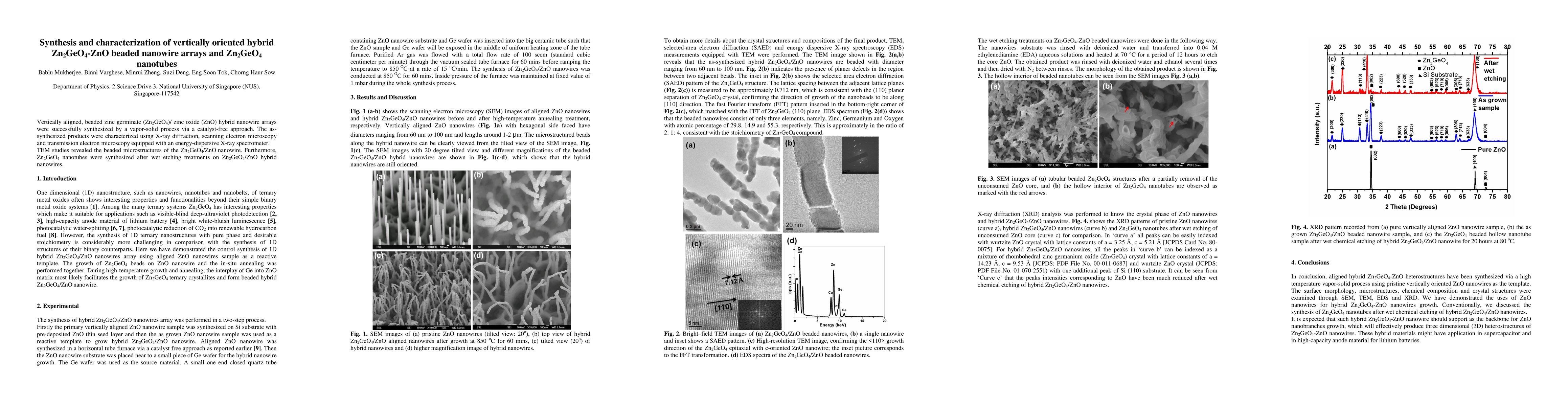 Vertically aligned, beaded zinc germinate (Zn2GeO4)/ zinc oxide (ZnO) hybrid nanowire arrays were successfully synthesized by a vapor-solid process via a catalyst-free approach. The as-synthesized products were characterized using X-ray diffraction, scanning electron microscopy and transmission electron microscopy equipped with an energy-dispersive X-ray spectrometer. TEM studies revealed the beaded microstructures of the Zn2GeO4/ZnO nanowire. Furthermore, Zn2GeO4 nanotubes were synthesized after wet etching treatments on Zn2GeO4/ZnO hybrid nanowires.