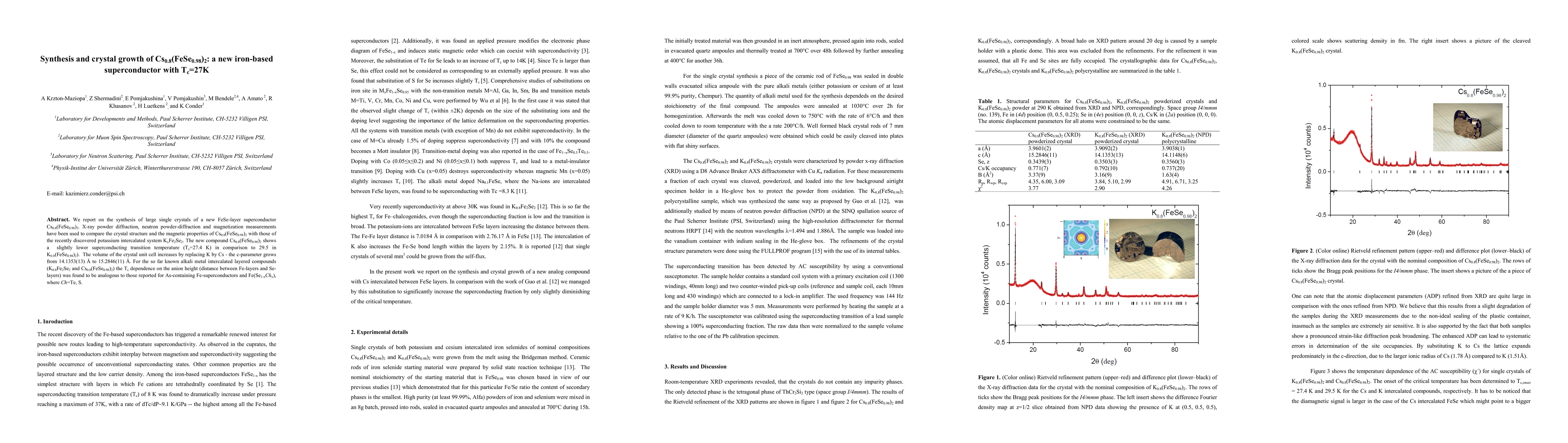 This paper details the synthesis of large single crystals of Cs0.8(FeSe0.98)2, a new iron-based superconductor with a superconducting transition temperature (Tc) of 27.4 K. Comparative studies reveal a structural and magnetic similarity to K0.8(FeSe0.98)2, with a larger unit cell and lower Tc due to the increased c-parameter.