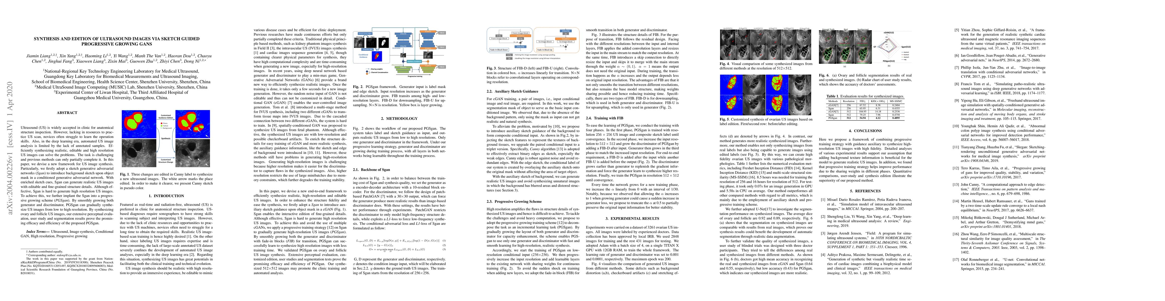 Ultrasound (US) is widely accepted in clinic for anatomical structure inspection. However, lacking in resources to practice US scan, novices often struggle to learn the operation skills. Also, in the deep learning era, automated US image analysis is limited by the lack of annotated samples. Efficiently synthesizing realistic, editable and high resolution US images can solve the problems. The task is challenging and previous methods can only partially complete it. In this paper, we devise a new framework for US image synthesis. Particularly, we firstly adopt a sketch generative adversarial networks (Sgan) to introduce background sketch upon object mask in a conditioned generative adversarial network. With enriched sketch cues, Sgan can generate realistic US images with editable and fine-grained structure details. Although effective, Sgan is hard to generate high resolution US images. To achieve this, we further implant the Sgan into a progressive growing scheme (PGSgan). By smoothly growing both generator and discriminator, PGSgan can gradually synthesize US images from low to high resolution. By synthesizing ovary and follicle US images, our extensive perceptual evaluation, user study and segmentation results prove the promising efficacy and efficiency of the proposed PGSgan.