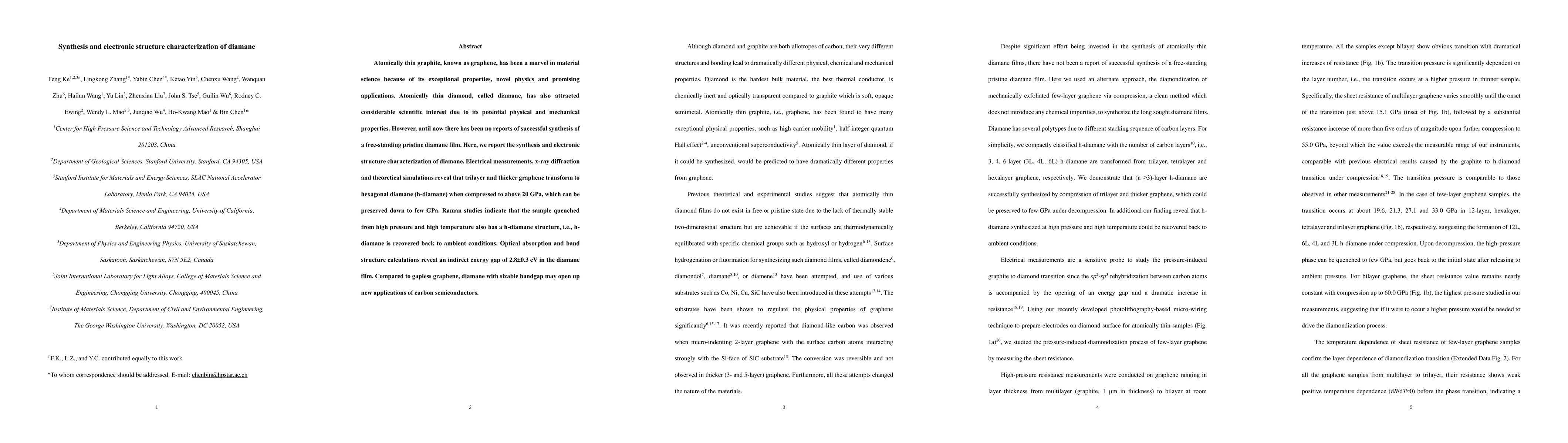 Atomically thin graphite, known as graphene, has been a marvel in material science because of its exceptional properties, novel physics and promising applications. Atomically thin diamond, called diamane, has also attracted considerable scientific interest due to its potential physical and mechanical properties. However, until now there has been no reports of successful synthesis of a free-standing pristine diamane film. Here, we report the synthesis and electronic structure characterization of diamane. Electrical measurements, x-ray diffraction and theoretical simulations reveal that trilayer and thicker graphene transform to hexagonal diamane (h-diamane) when compressed to above 20 GPa, which can be preserved down to few GPa. Raman studies indicate that the sample quenched from high pressure and high temperature also has a h-diamane structure, i.e., h-diamane is recovered back to ambient conditions. Optical absorption and band structure calculations reveal an indirect energy gap of 2.8 eV in the diamane film. Compared to gapless graphene, diamane with sizable bandgap may open up new applications of carbon semiconductors.