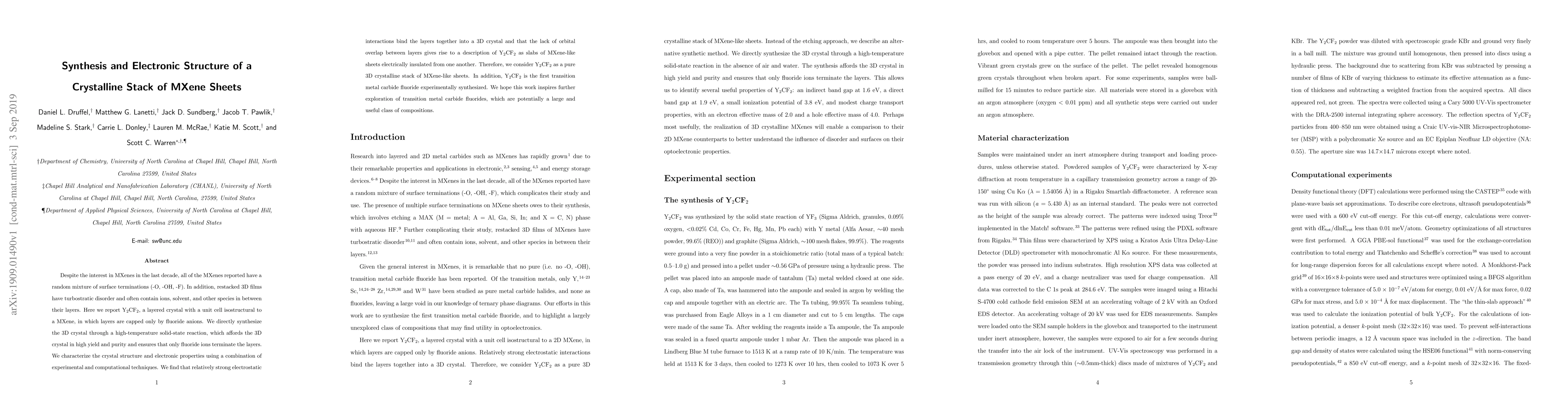 Despite the interest in MXenes in the last decade, all of the MXenes reported have a random mixture of surface terminations (-O, -OH, -F). In addition, restacked films have turbostratic disorder and often contain ions, solvent, and other species in between their layers. Here we report Y2CF2, a layered crystal with a unit cell isostructural to a MXene, in which layers are capped only by fluoride anions. We directly synthesize the 3D crystal through a high-temperature solid-state reaction, which affords the 3D crystal in high yield and purity and ensures that only fluoride ions terminate the layers. We characterize the crystal structure and electronic properties using a combination of experimental and computational techniques. We find that relatively strong electrostatic interactions bind the layers together into a 3D crystal and that the lack of orbital overlap between layers gives rise to a description of Y2CF2 as slabs of MXene-like sheets electrically insulated from one another. Therefore, we consider Y2CF2 as a pure 3D crystalline stack of MXene-like sheets. In addition, Y2CF2 is the first transition metal carbide fluoride experimentally synthesized. We hope this work inspires further exploration of transition metal carbide fluorides, which are potentially a large and useful class of compositions.
