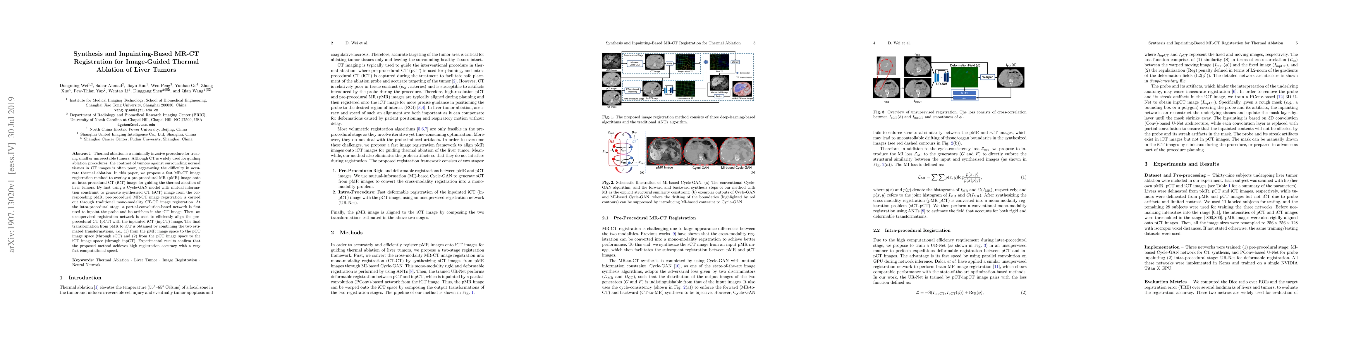 This paper proposes a fast MR-CT registration method for guiding thermal ablation of liver tumors by overlaying pre-procedural MR images onto intra-procedural CT images. It uses a Cycle-GAN model to generate synthesized CT images from MR and employs a partial-convolution network for inpainting artifacts before registration, achieving high accuracy and speed.