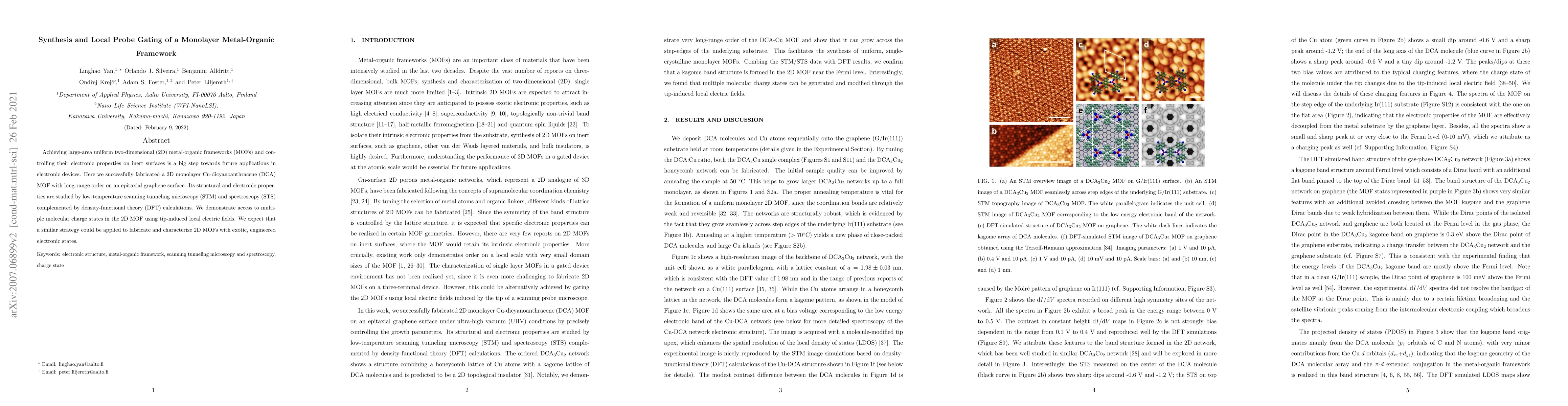Achieving large-area uniform two-dimensional (2D) metal-organic frameworks (MOFs) and controlling their electronic properties on inert surfaces is a big step towards future applications in electronic devices. Here we successfully fabricated a 2D monolayer Cu-dicyanoanthracene (DCA) MOF with long-range order on an epitaxial graphene surface. Its structural and electronic properties are studied by low-temperature scanning tunneling microscopy (STM) and spectroscopy (STS) complemented by density-functional theory (DFT) calculations. We demonstrate access to multiple molecular charge states in the 2D MOF using tip-induced local electric fields. We expect that a similar strategy could be applied to fabricate and characterize 2D MOFs with exotic, engineered electronic states.