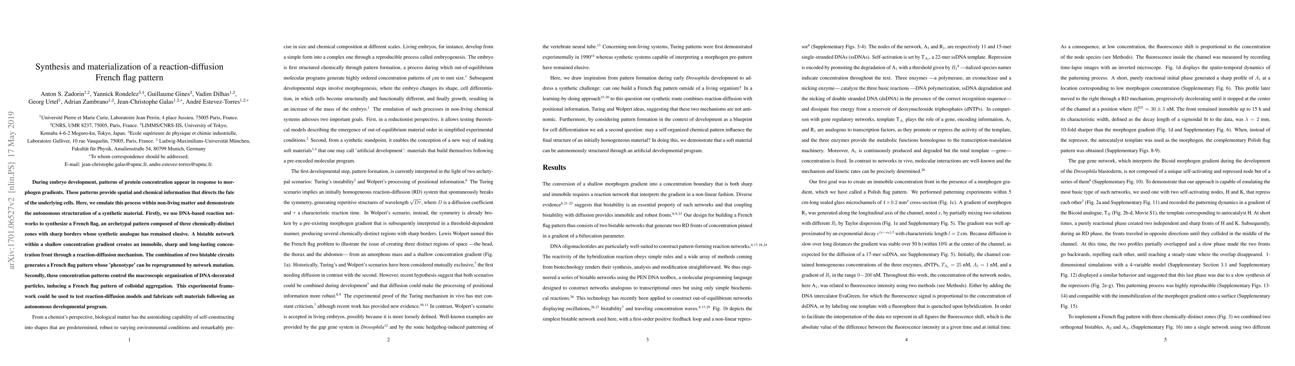 During embryo development, patterns of protein concentration appear in response to morphogen gradients. These patterns provide spatial and chemical information that directs the fate of the underlying cells. Here, we emulate this process within non-living matter and demonstrate the autonomous structuration of a synthetic material. Firstly, we use DNA-based reaction networks to synthesize a French flag, an archetypal pattern composed of three chemically-distinct zones with sharp borders whose synthetic analogue has remained elusive. A bistable network within a shallow concentration gradient creates an immobile, sharp and long-lasting concentration front through a reaction-diffusion mechanism. The combination of two bistable circuits generates a French flag pattern whose 'phenotype' can be reprogrammed by network mutation. Secondly, these concentration patterns control the macroscopic organization of DNA-decorated particles, inducing a French flag pattern of colloidal aggregation. This experimental framework could be used to test reaction-diffusion models and fabricate soft materials following an autonomous developmental program.