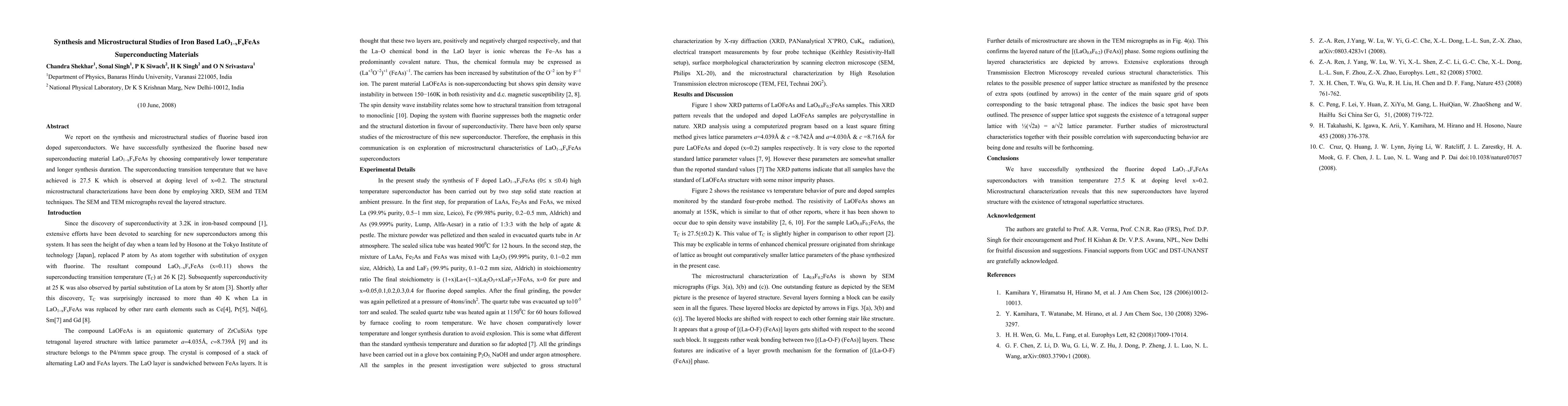 We report on the synthesis and microstructural studies of fluorine based iron doped superconductors. We have successfully synthesized the fluorine based new superconducting material LaO1-xFxFeAs by choosing comparatively lower temperature and longer synthesis duration. The superconducting transition temperature that we have achieved is 27.5 K which is observed at doping level of x=0.2. The structural microstructural characterizations have been done by employing XRD, SEM and TEM techniques. The SEM and TEM micrographs reveal the layered structure.