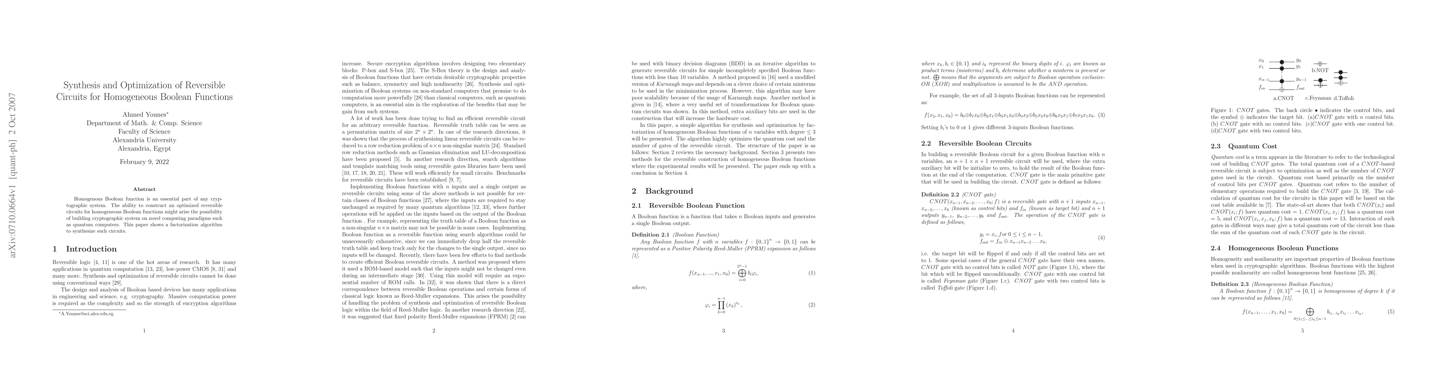 Homogenous Boolean function is an essential part of any cryptographic system. The ability to construct an optimized reversible circuits for homogeneous Boolean functions might arise the possibility of building cryptographic system on novel computing paradigms such as quantum computers. This paper shows a factorization algorithm to synthesize such circuits.