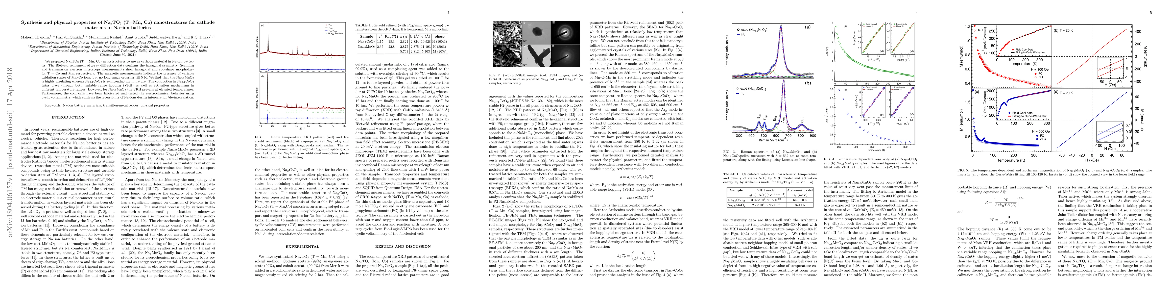 We prepared Na$_x$TO$_2$ (T = Mn, Co) nanostructures to use as cathode material in Na-ion batteries. The Rietveld refinement of x-ray diffraction data confirms the hexagonal symmetry. Scanning and transmission electron microscopy measurements show hexagonal and rod-shape morphology for T = Co and Mn, respectively. The magnetic measurements indicate the presence of variable oxidation states of Mn/Co ions, but no long range ordering till 5~K. We find that the Na$_{0.6}$MnO$_2$ is highly insulating whereas Na$_{0.7}$CoO$_2$ is semiconducting in nature. The conduction in Na$_{0.7}$CoO$_2$ takes place through both variable range hopping (VRH) as well as activation mechanisms in different temperature ranges. However, for Na$_{0.6}$MnO$_2$ the VRH prevails at elevated temperatures. Furthermore, the coin cells have been fabricated and tested the electrochemical behavior using cyclic voltammetry, which confirms the reversibility of Na--ions during intercalation/de-intercalation.