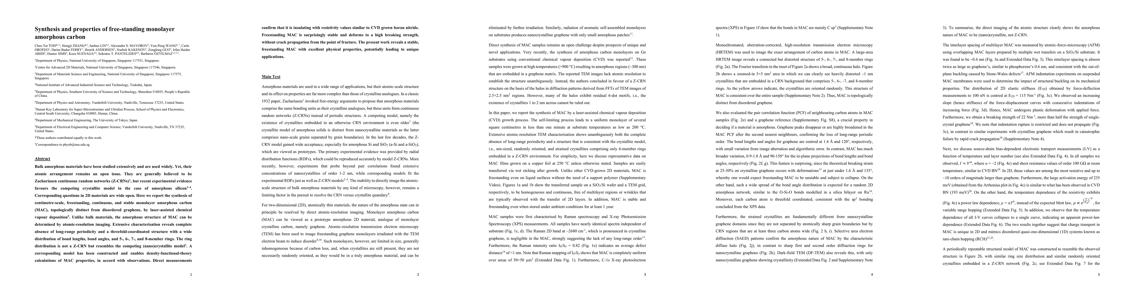 This paper reports the synthesis of free-standing monolayer amorphous carbon using laser-assisted chemical vapour deposition, revealing a structure with no long-range periodicity and a distribution of bond lengths and angles resembling the competing (nano)crystallite model. The material is insulating and highly stable, with potential applications in permeation and diffusion barriers.